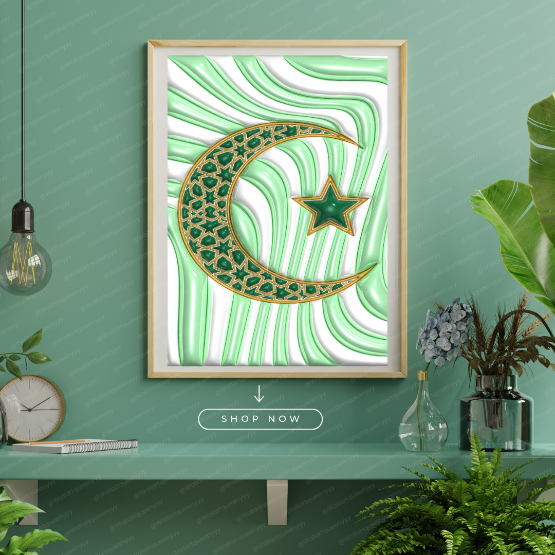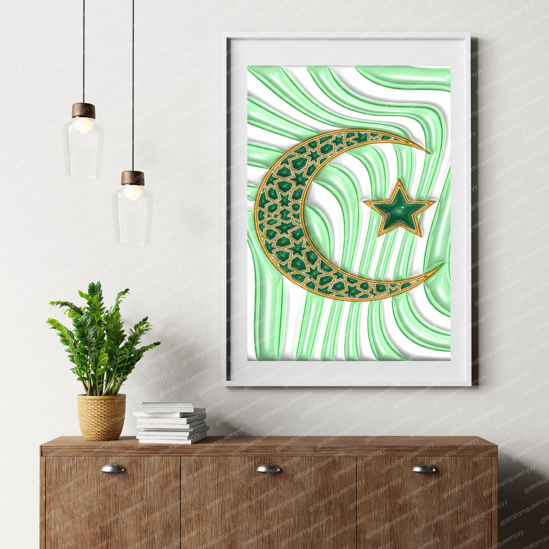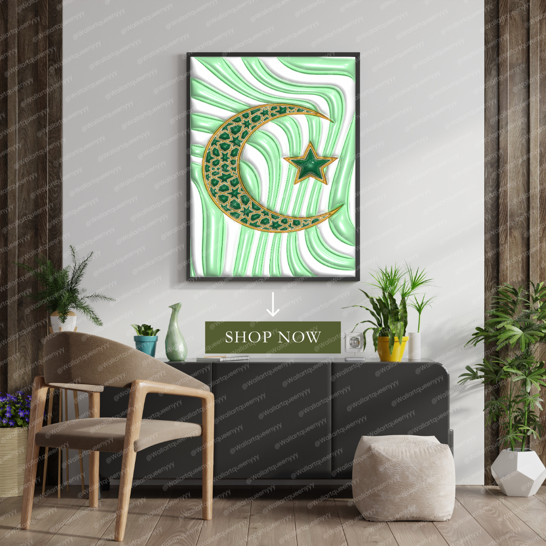 Islamic wall art printable featuring the Islamic Crescent & Star symbol is designed to represent faith, spirituality, and timeless Islamic identity. This islamic wall art printable combines elegant symbolism with refined decorative aesthetics, making it ideal for Muslim homes, prayer spaces, and Eid celebrations.