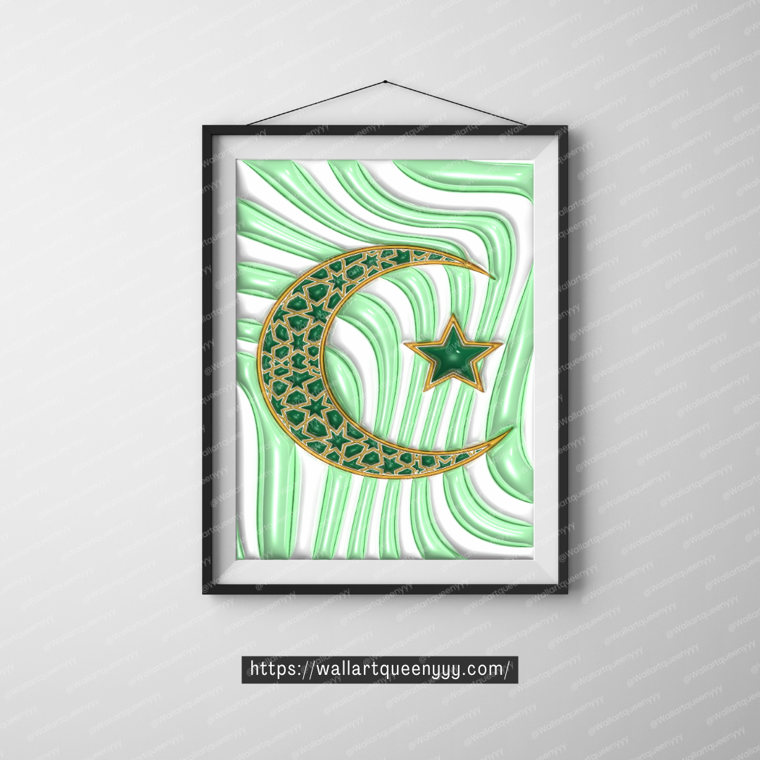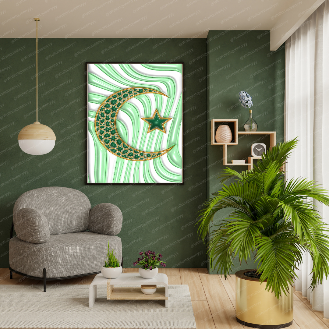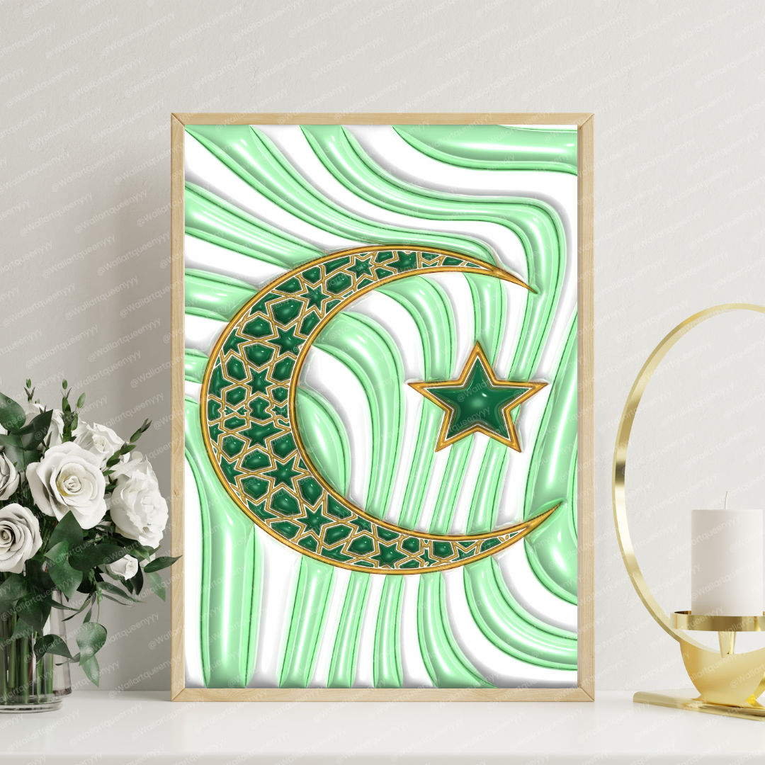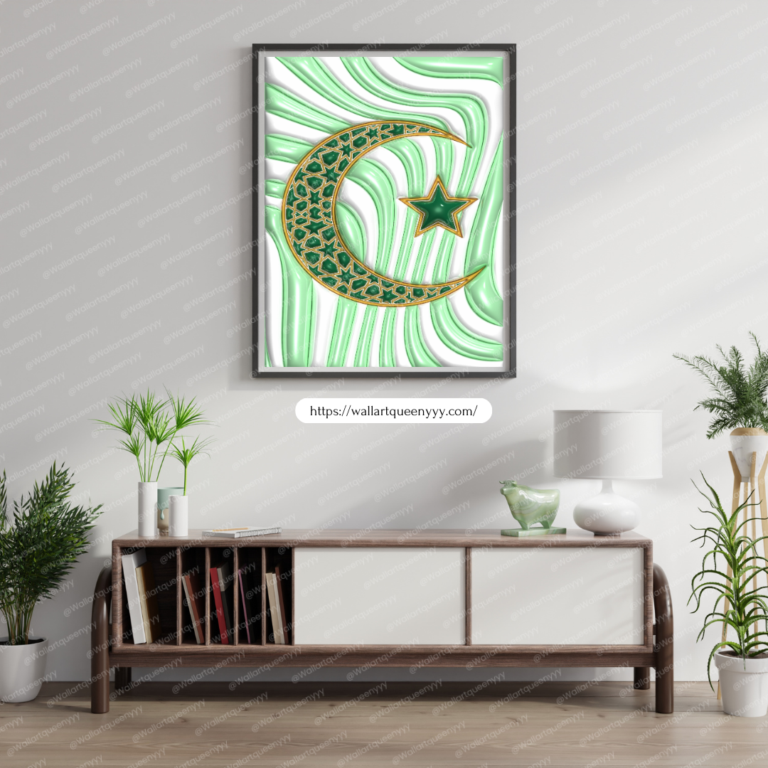 Islamic wall art printable featuring the Islamic Crescent & Star symbol is designed to represent faith, spirituality, and timeless Islamic identity. This islamic wall art printable combines elegant symbolism with refined decorative aesthetics, making it ideal for Muslim homes, prayer spaces, and Eid celebrations.