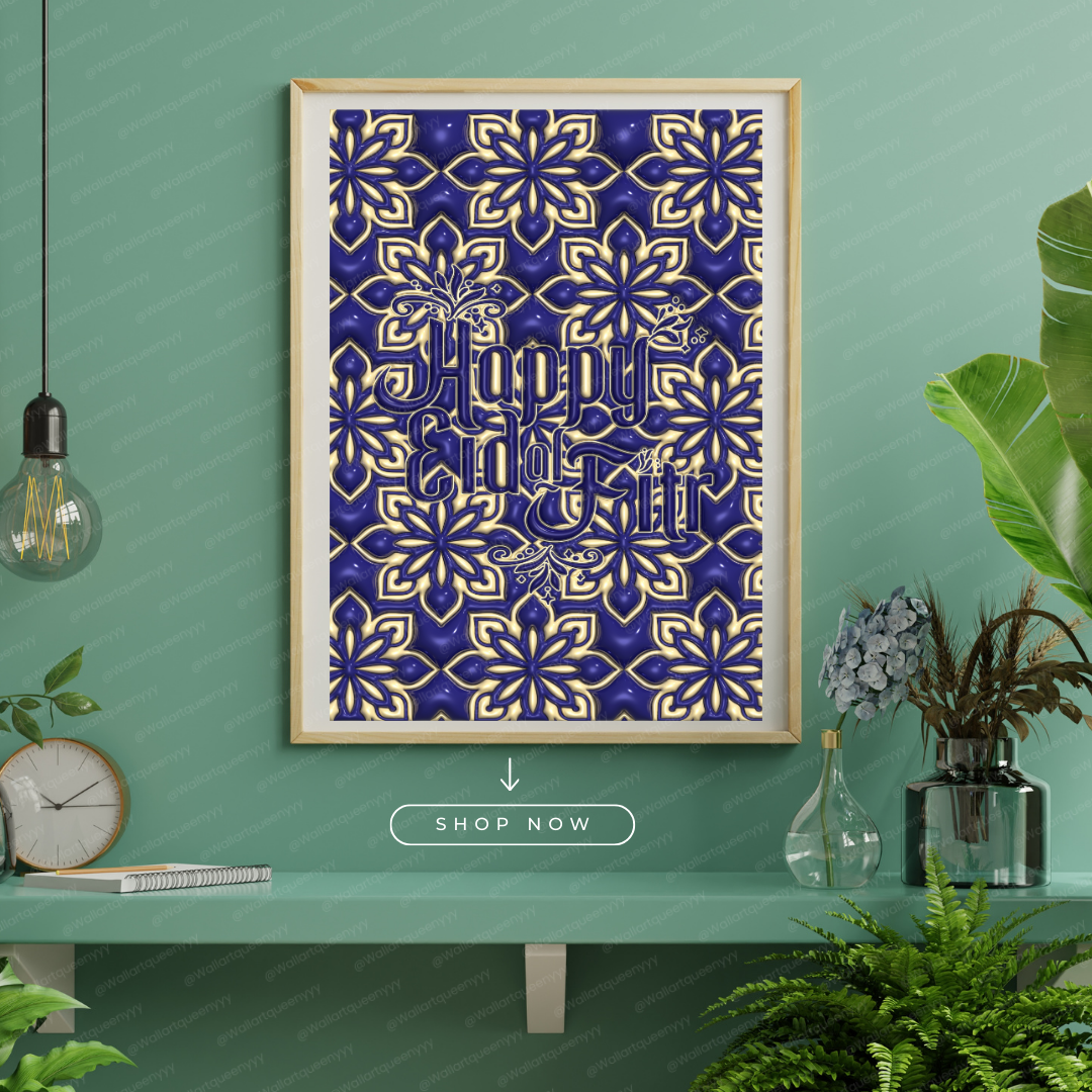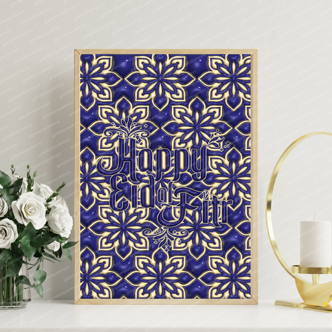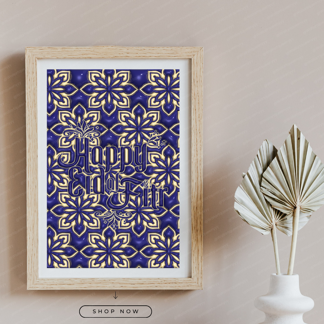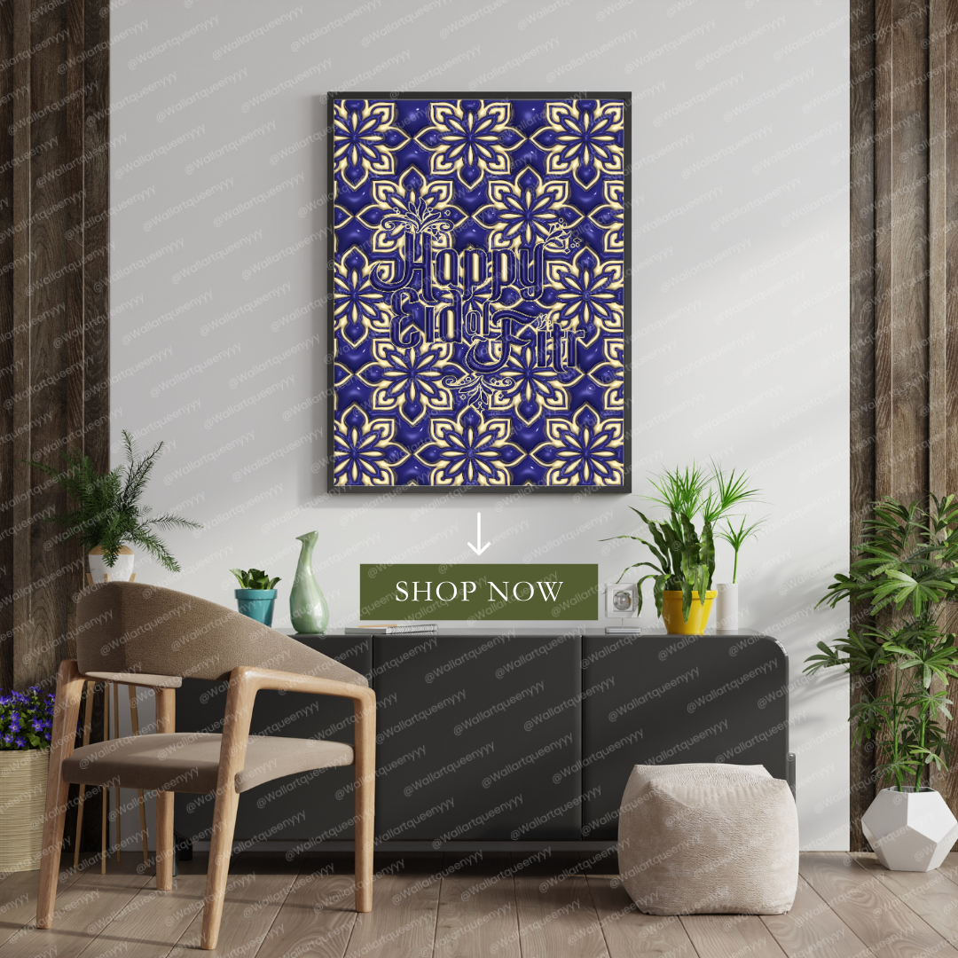 Islamic wall art printable featuring the phrase Happy Eid al-Fitr is designed to celebrate the joy, gratitude, and spiritual meaning of Eid al-Fitr. This islamic wall art printable combines elegant typography with a refined festive aesthetic, making it perfect for Muslim homes, prayer spaces, and Eid celebrations.