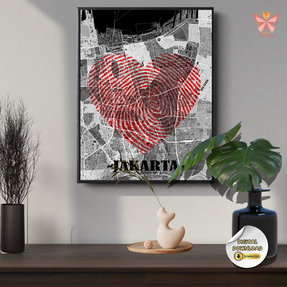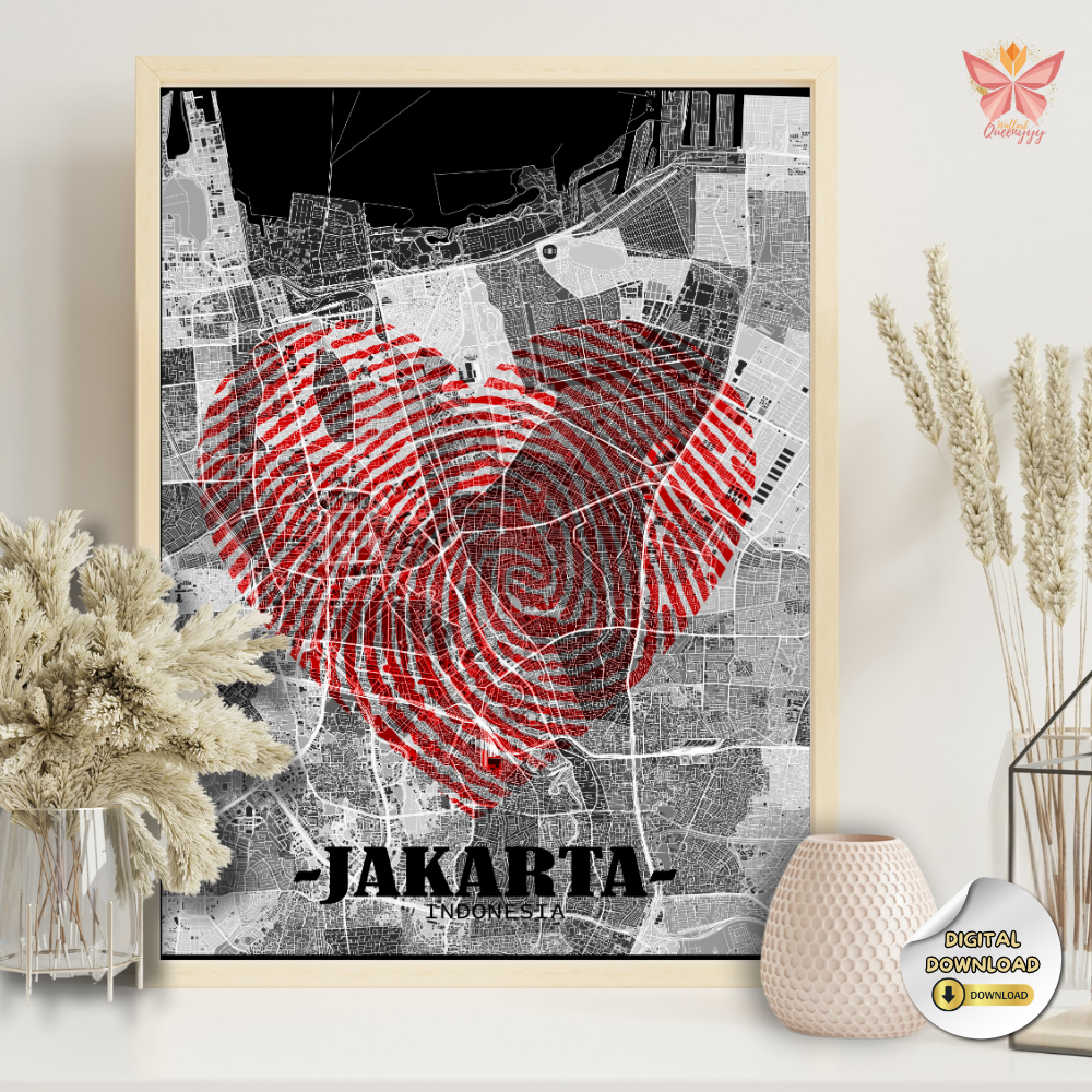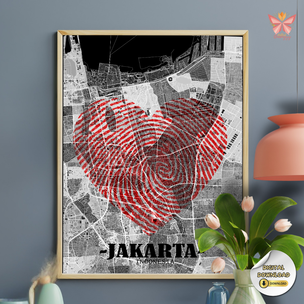 Jakarta Love Map Wall Art – Red Fingerprint Heart City Design