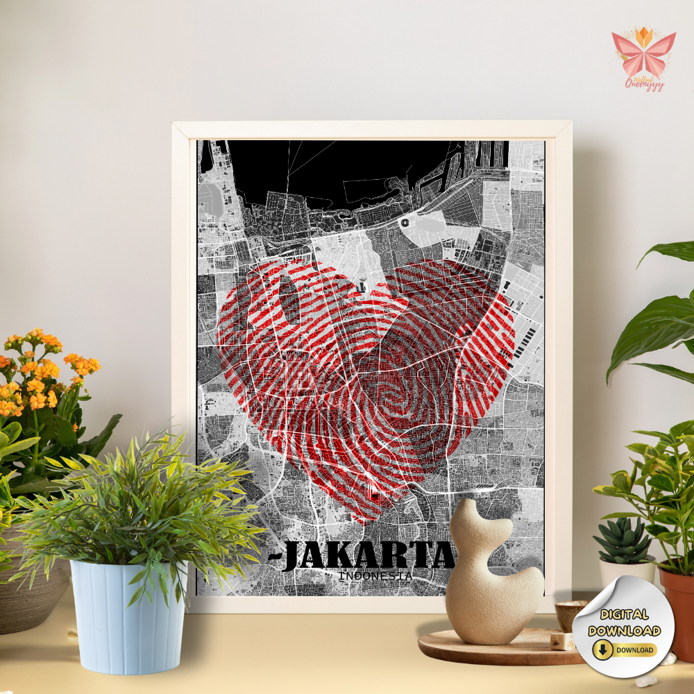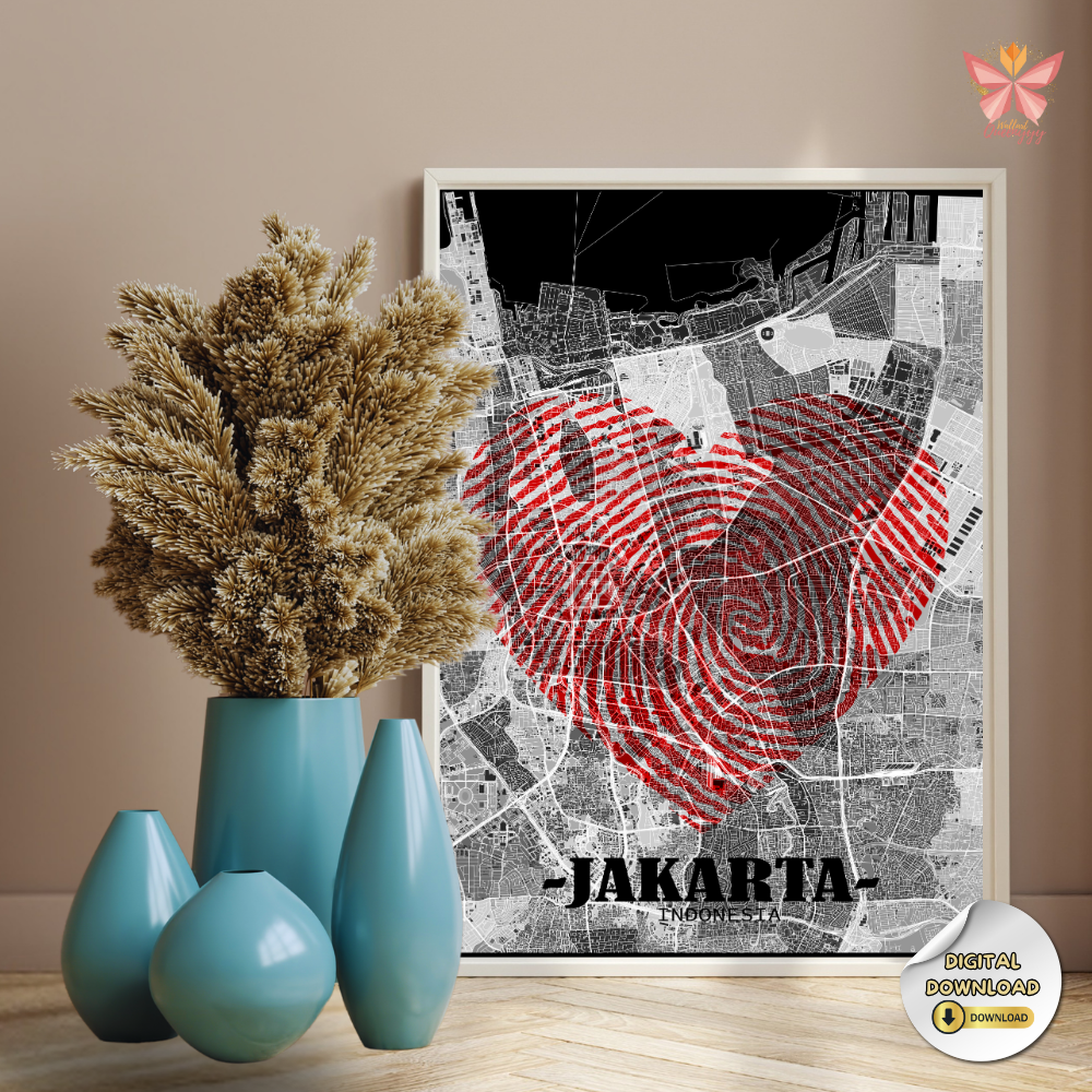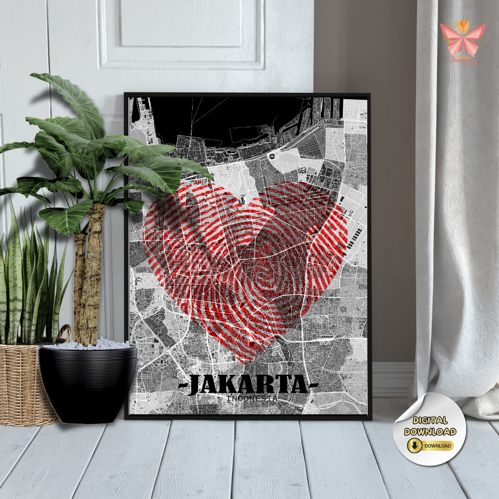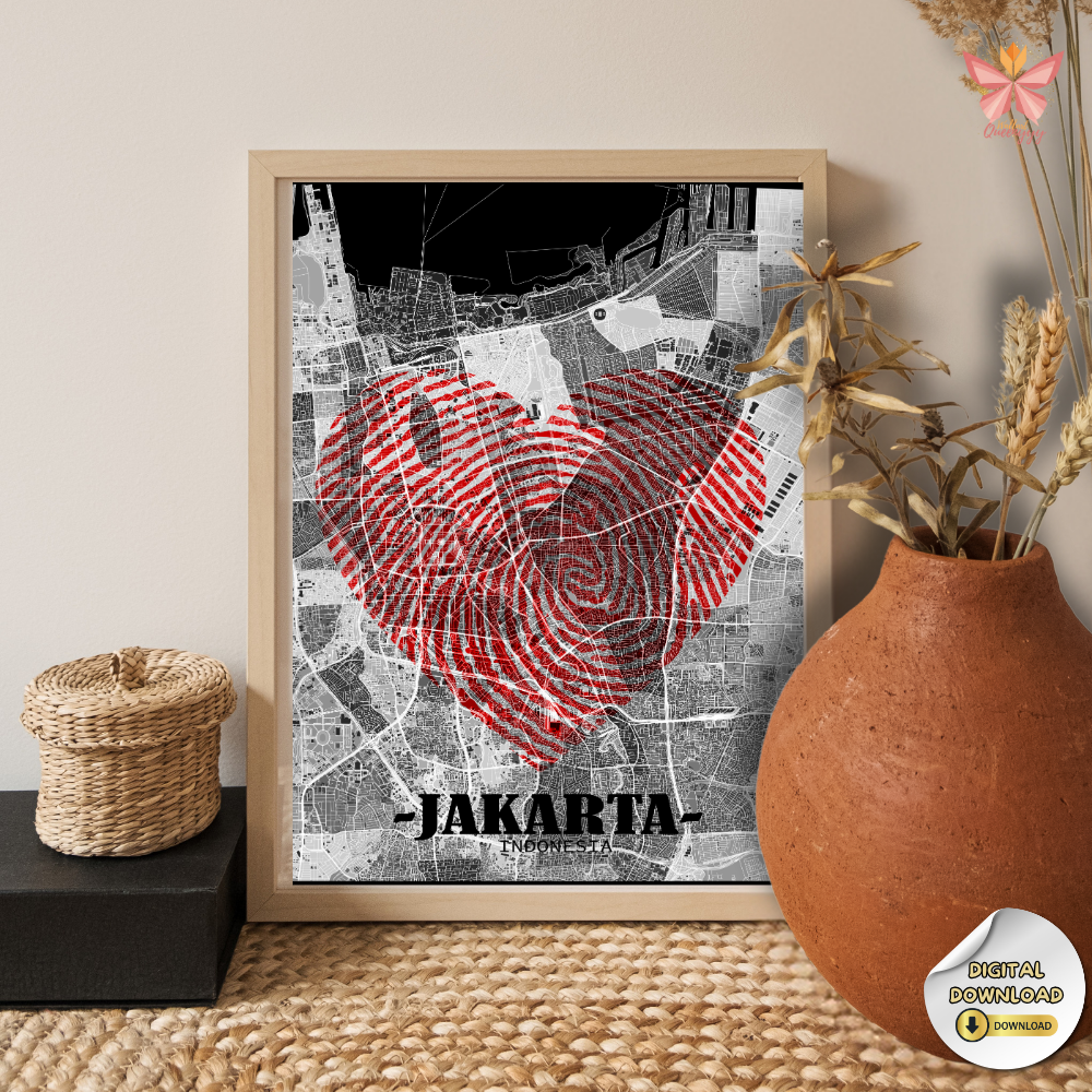 Jakarta Love Map Wall Art – Red Fingerprint Heart City Design