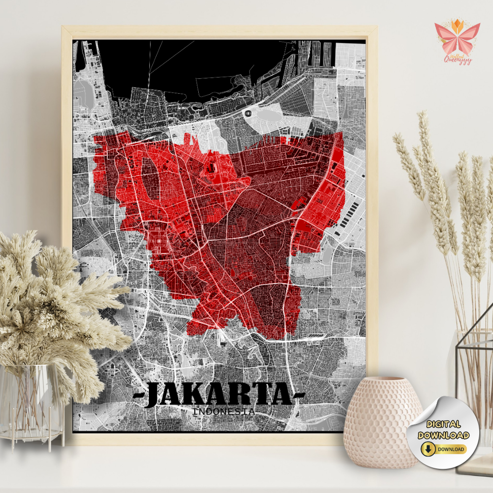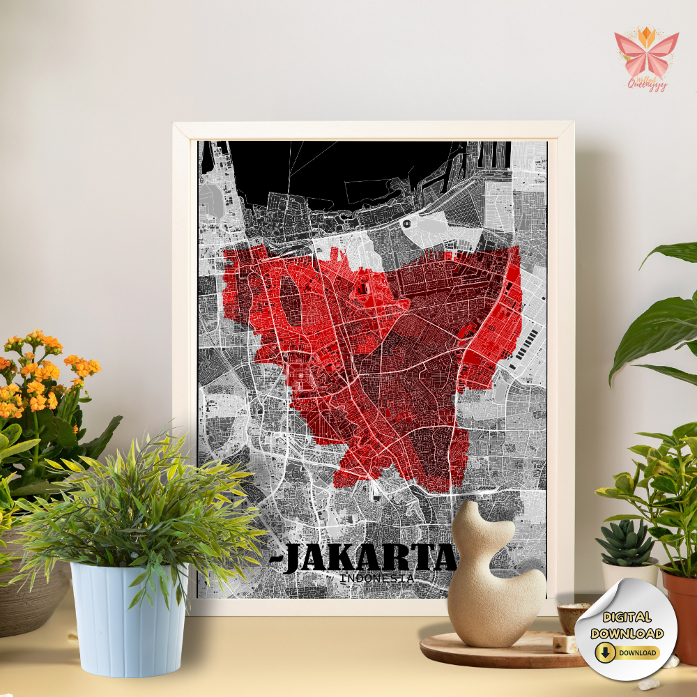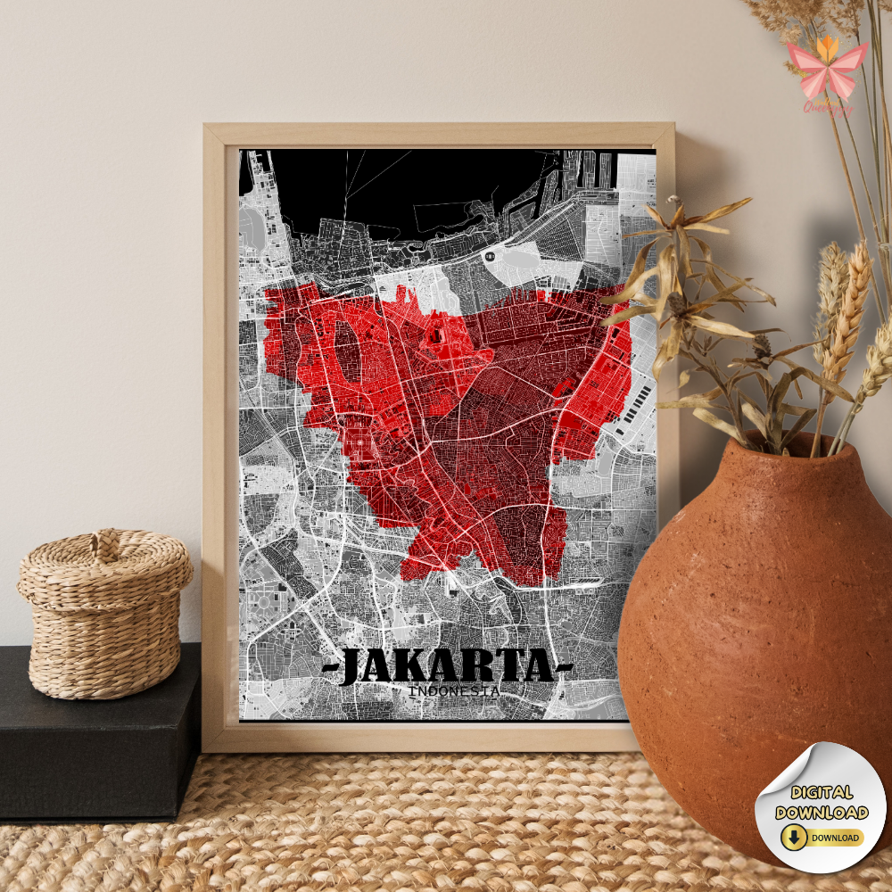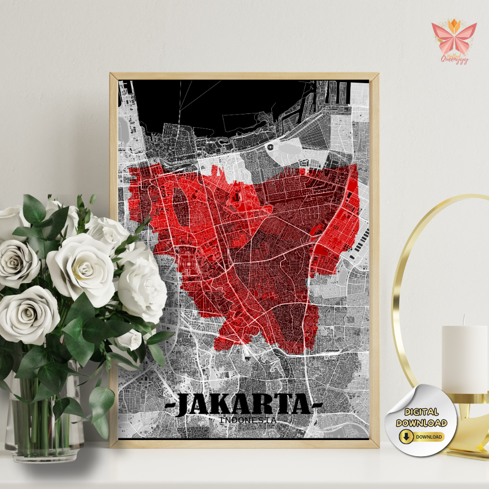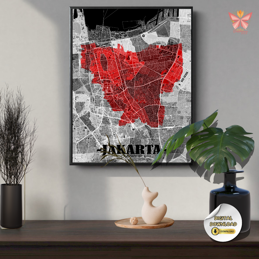 Jakarta urban map art is a modern printable wall art featuring a detailed monochrome city layout highlighted by a bold red core. Inspired by contemporary cartographic design and minimalist aesthetics, this artwork presents the urban structure of Jakarta, rendered in a clean, architectural visual style that emphasizes clarity, structure, and modern urban design.