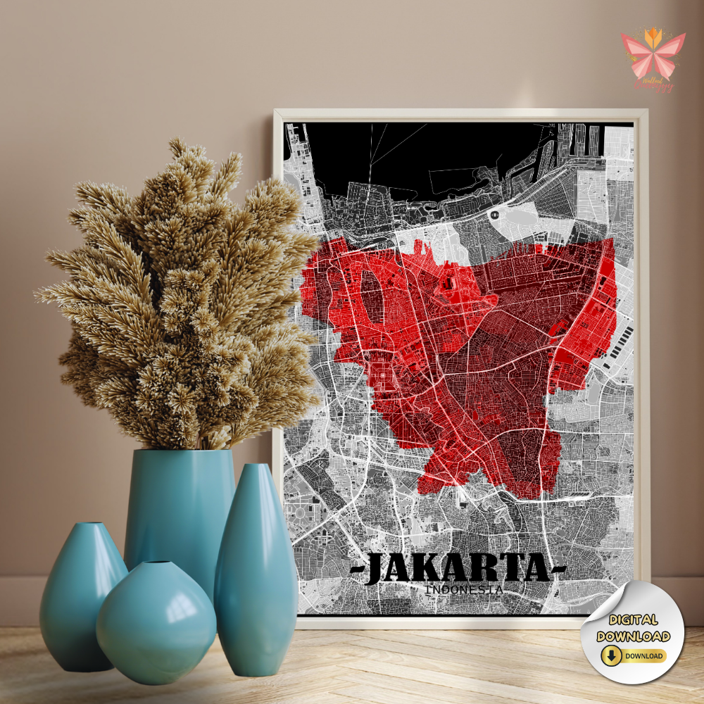 This city map wall art uses a monochrome palette to emphasize clarity, structure, and balance, while the red core marks the city’s central urban area. The contrast between black, white, and red creates a striking focal point that symbolizes the heart of Jakarta’s metropolitan life.