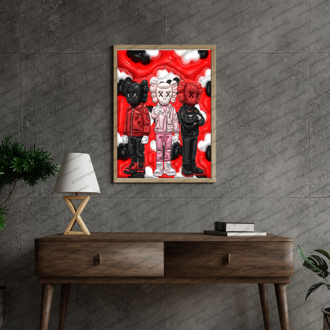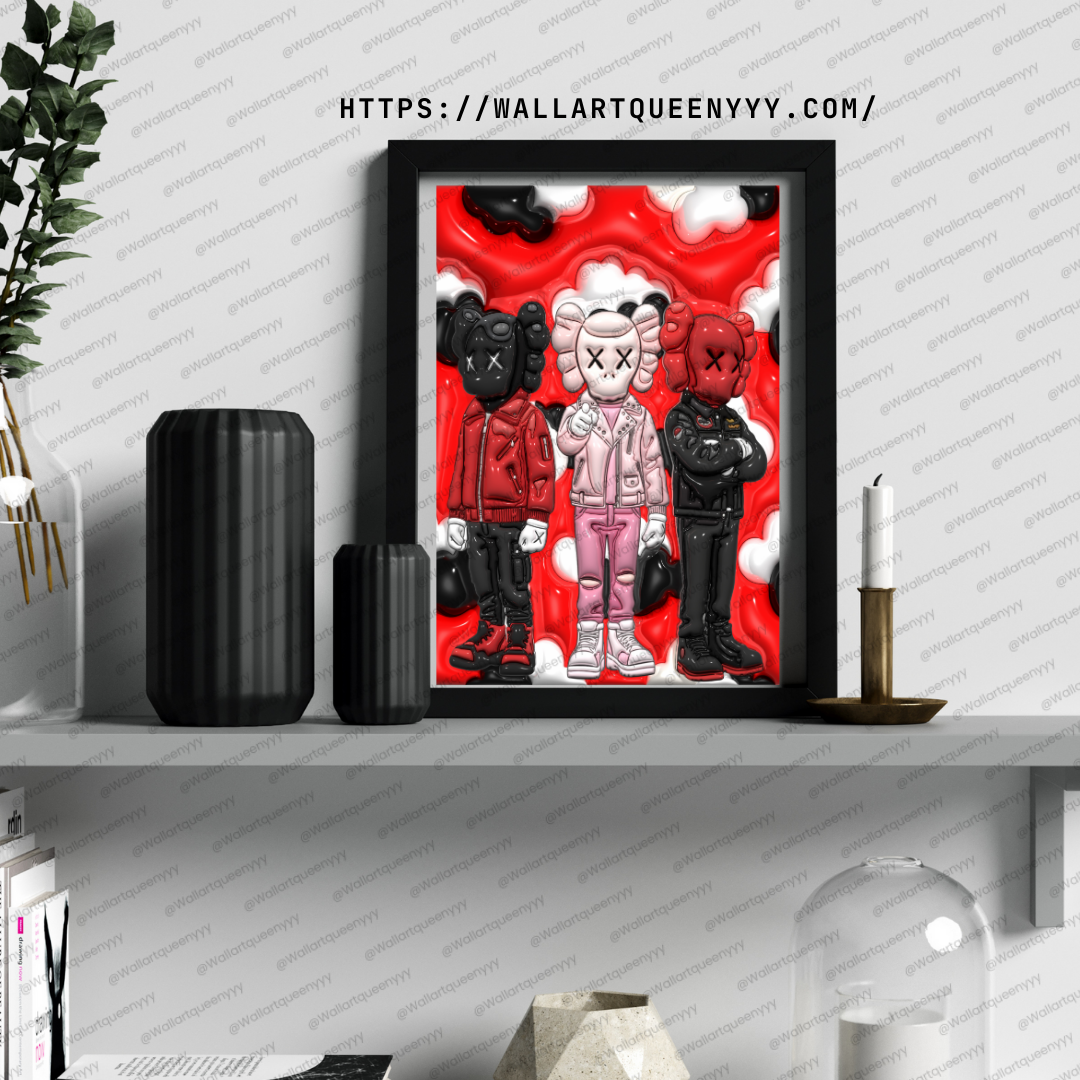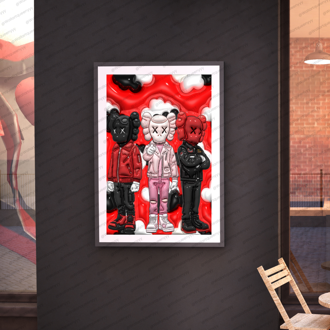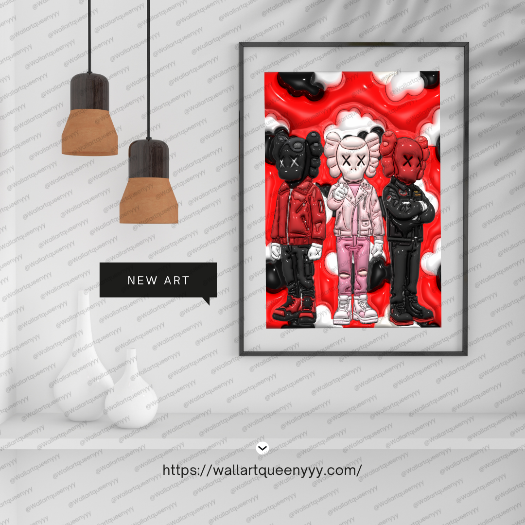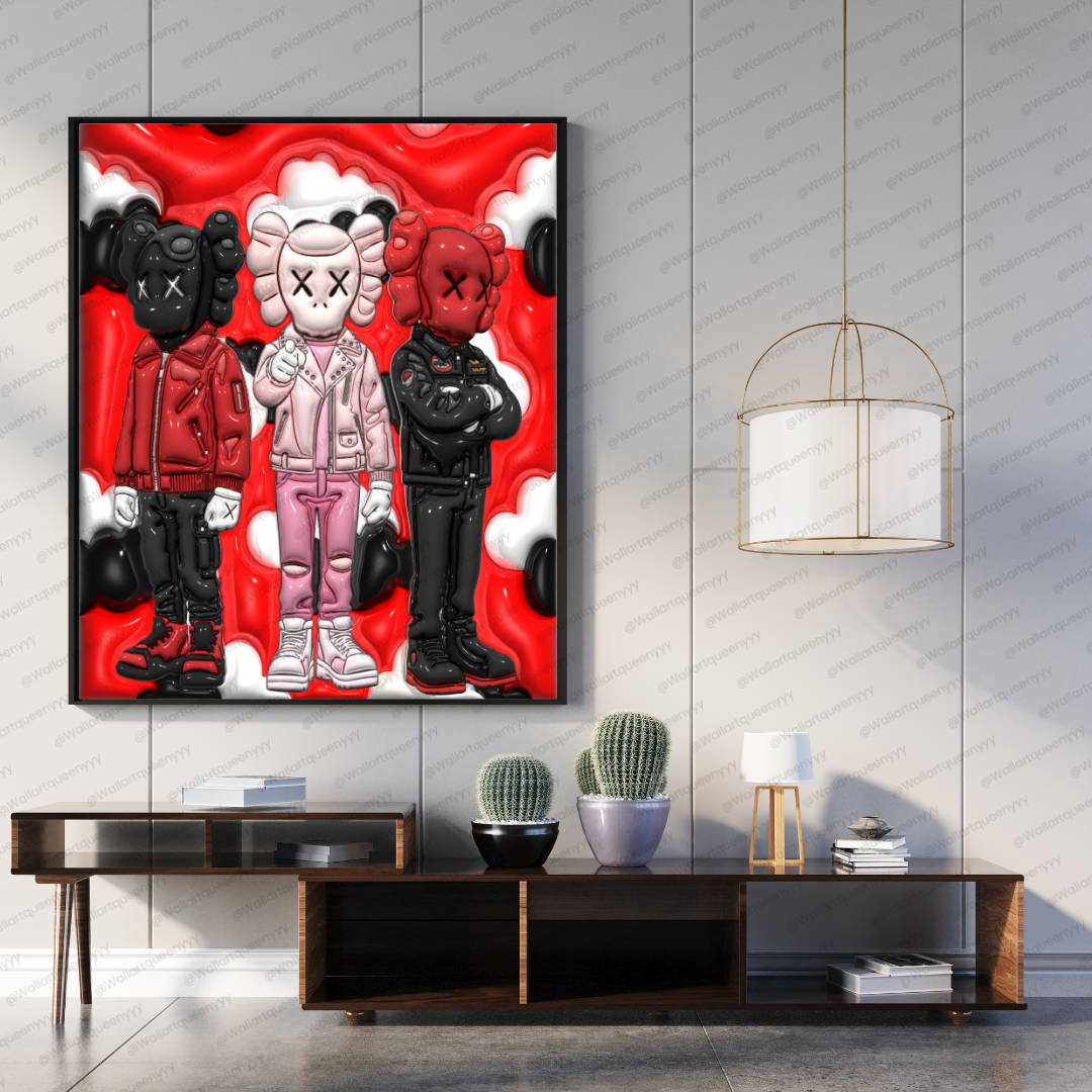 Modern Street pop art is known for bold colors, expressive characters, and street-inspired visuals. This KAWS-inspired trio wall art combines red and pink pop art tones with toy-style characters, creating an energetic and contemporary look that resonates with modern art lovers and street culture enthusiasts.