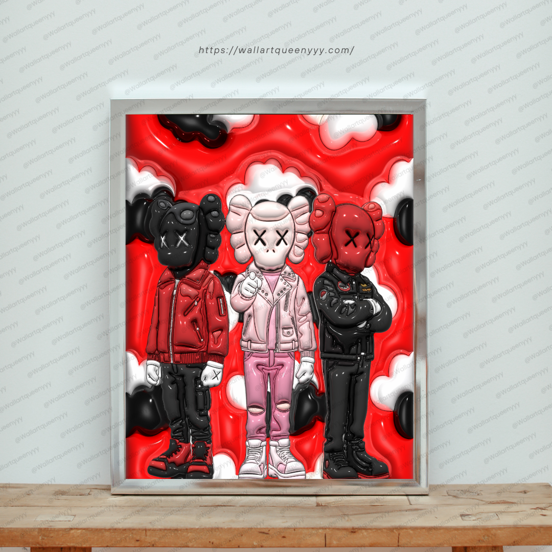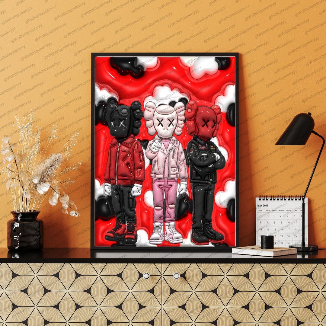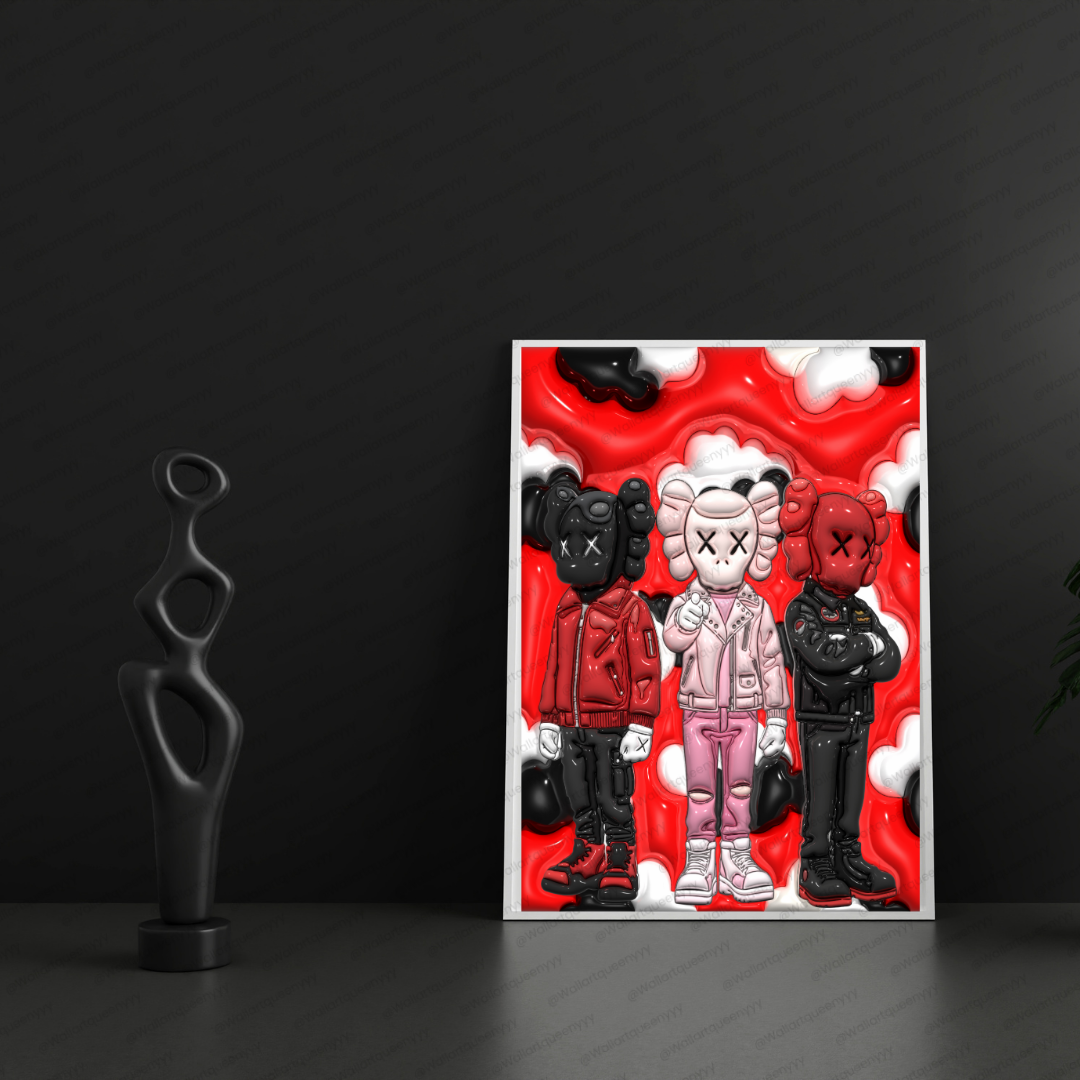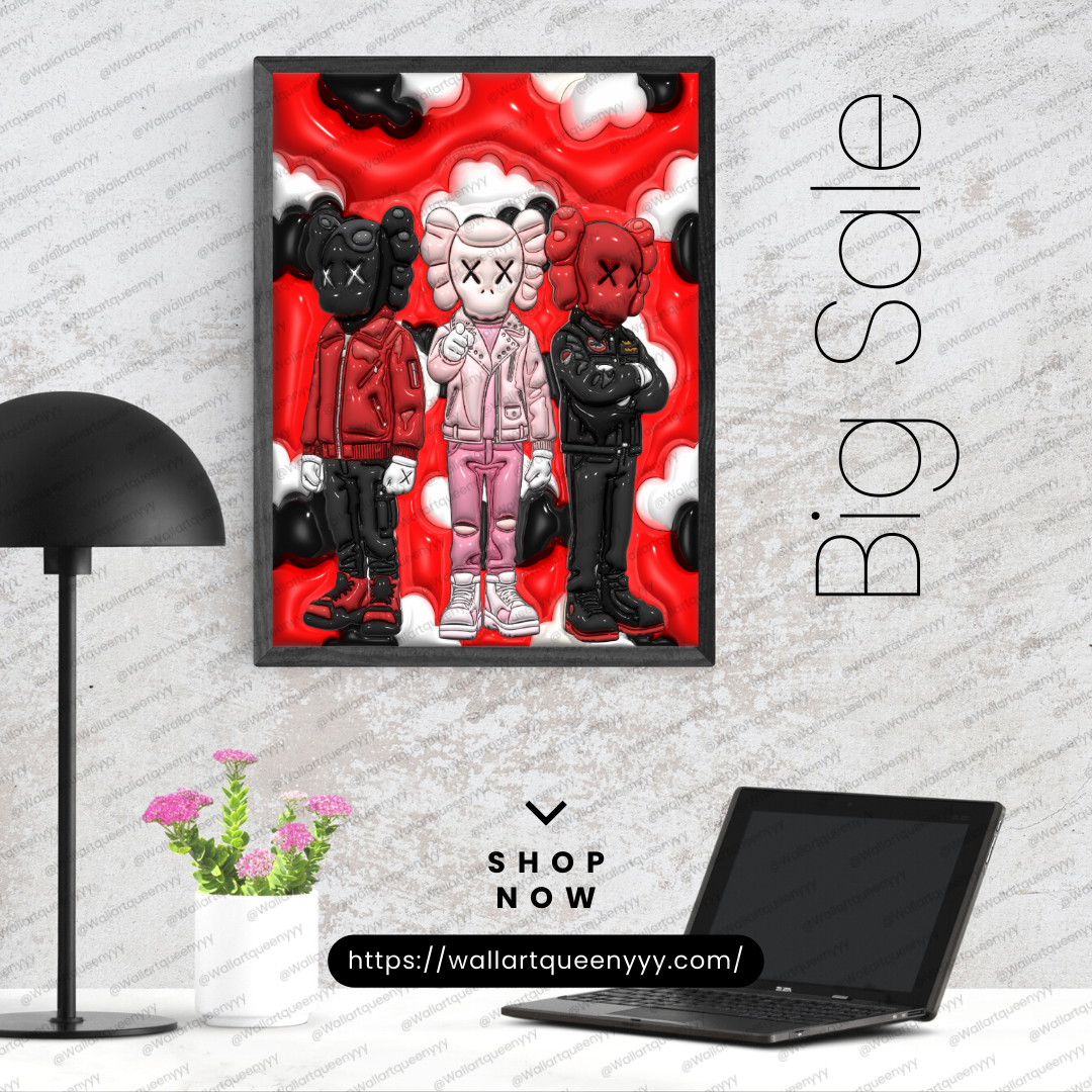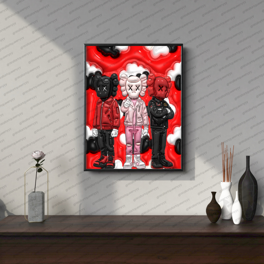 Modern Street pop art is known for bold colors, expressive characters, and street-inspired visuals. This KAWS-inspired trio wall art combines red and pink pop art tones with toy-style characters, creating an energetic and contemporary look that resonates with modern art lovers and street culture enthusiasts.