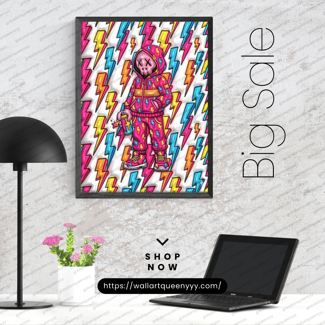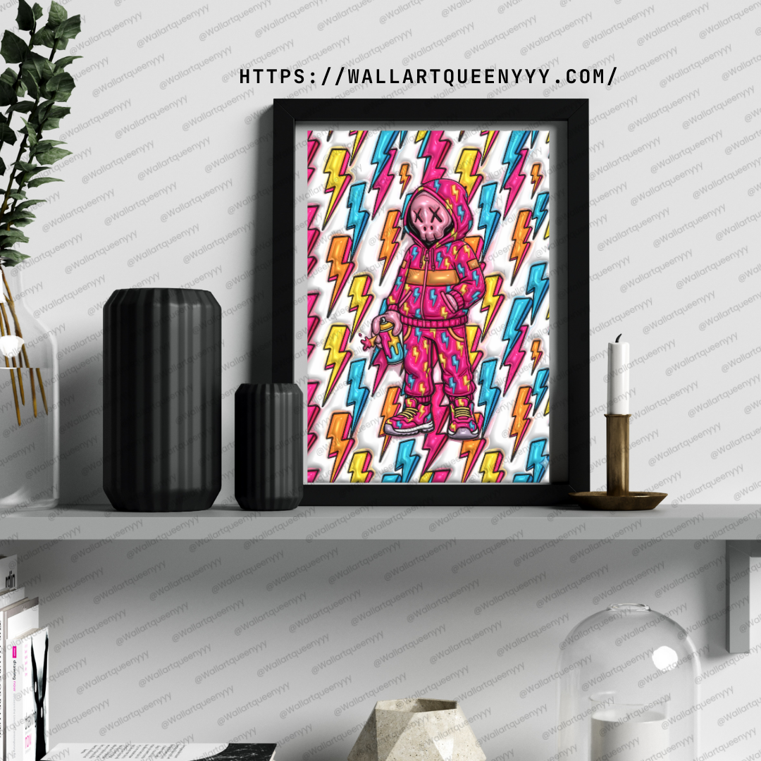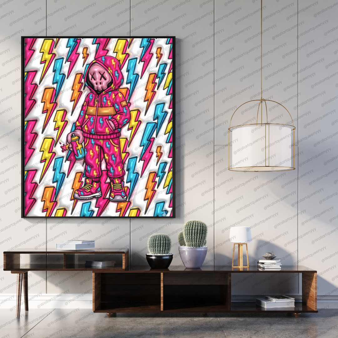 This pop art wall art pairs perfectly with minimalist furniture, industrial interiors, modern street decor, and colorful accent spaces. The colorful pop art toy combined with lightning pattern elements creates a powerful focal point that energizes contemporary wall art collections.