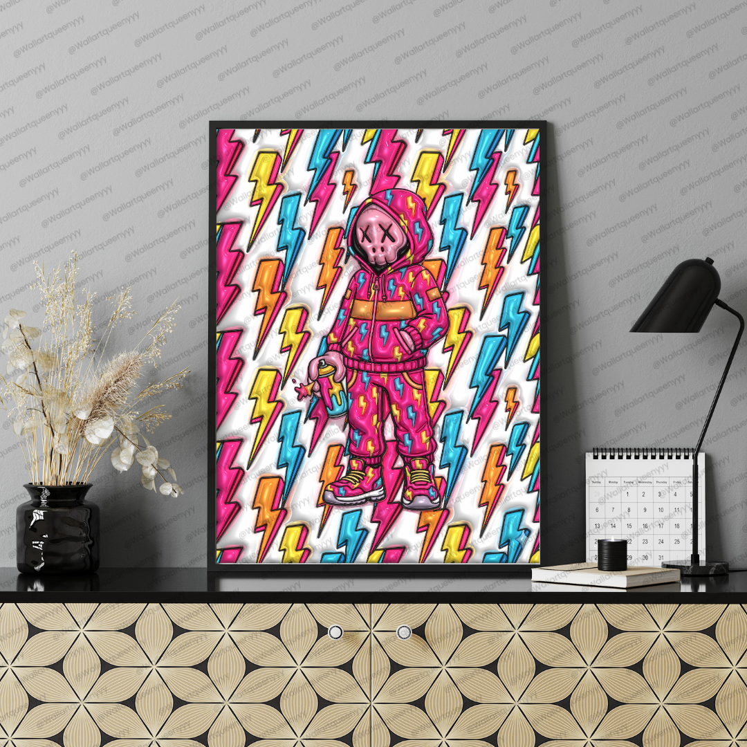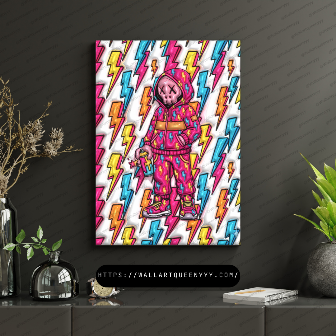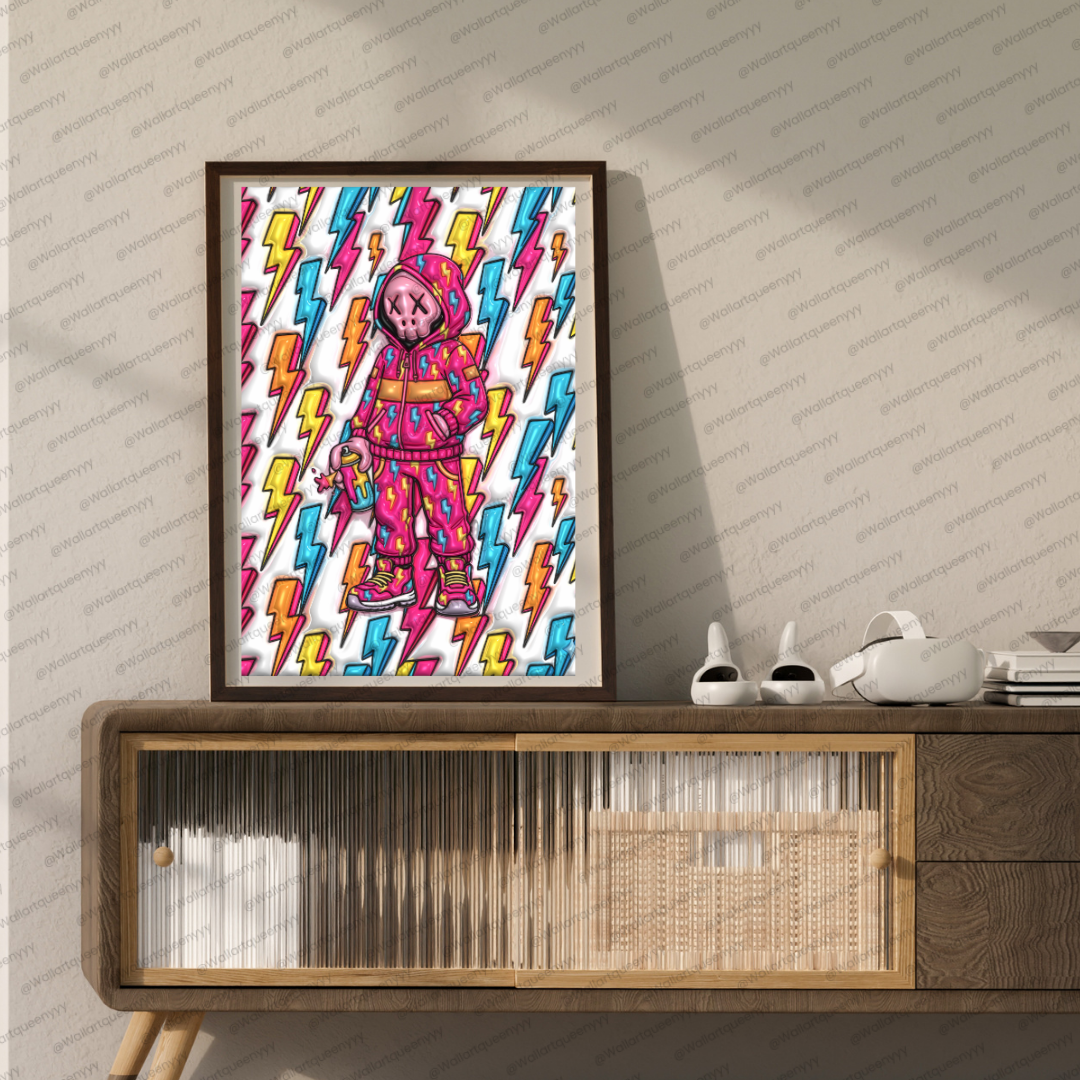 This Modern Streetwall art combines a playful toy-style character with lightning-inspired graphic elements that symbolize power, speed, and creative energy. The colorful palette enhances visual excitement, while the lightning pattern adds sharp movement and dynamic rhythm to the composition.