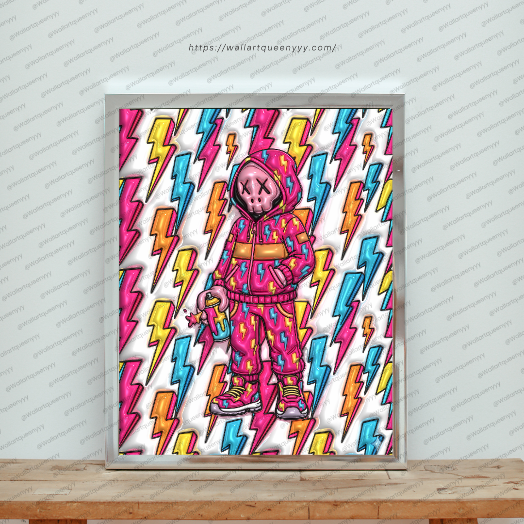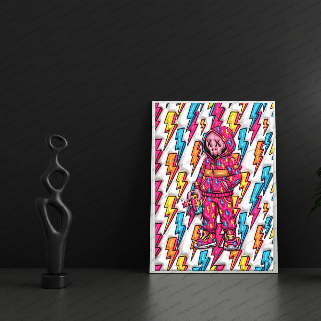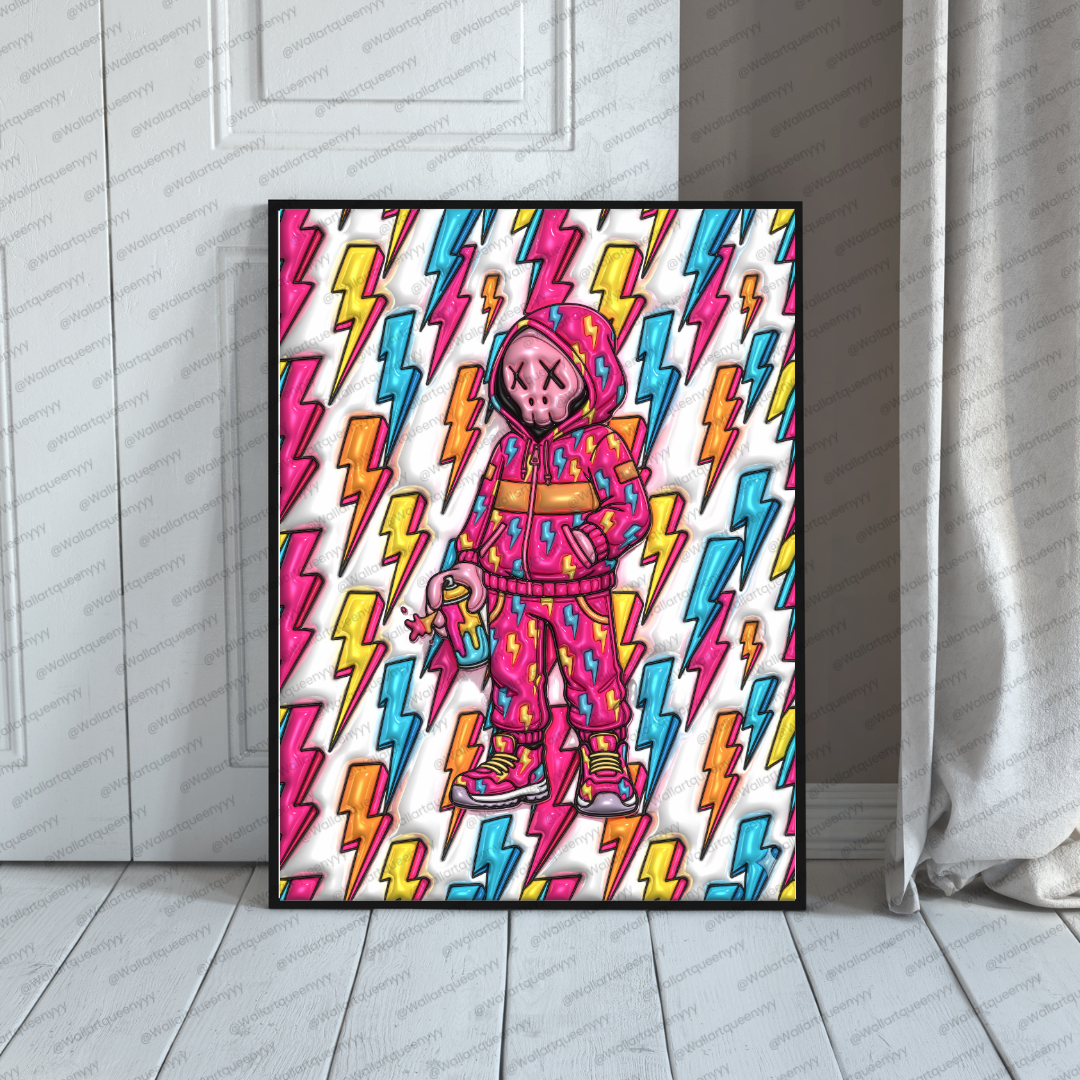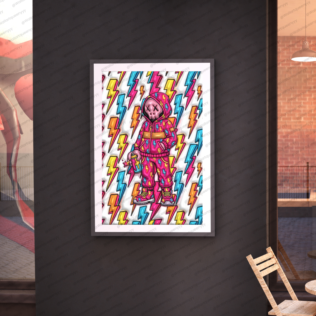 This Modern Streetwall art combines a playful toy-style character with lightning-inspired graphic elements that symbolize power, speed, and creative energy. The colorful palette enhances visual excitement, while the lightning pattern adds sharp movement and dynamic rhythm to the composition.