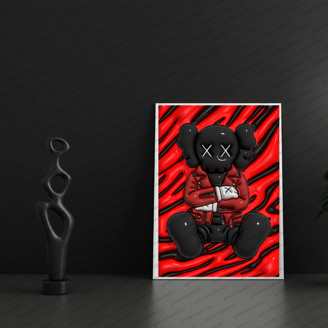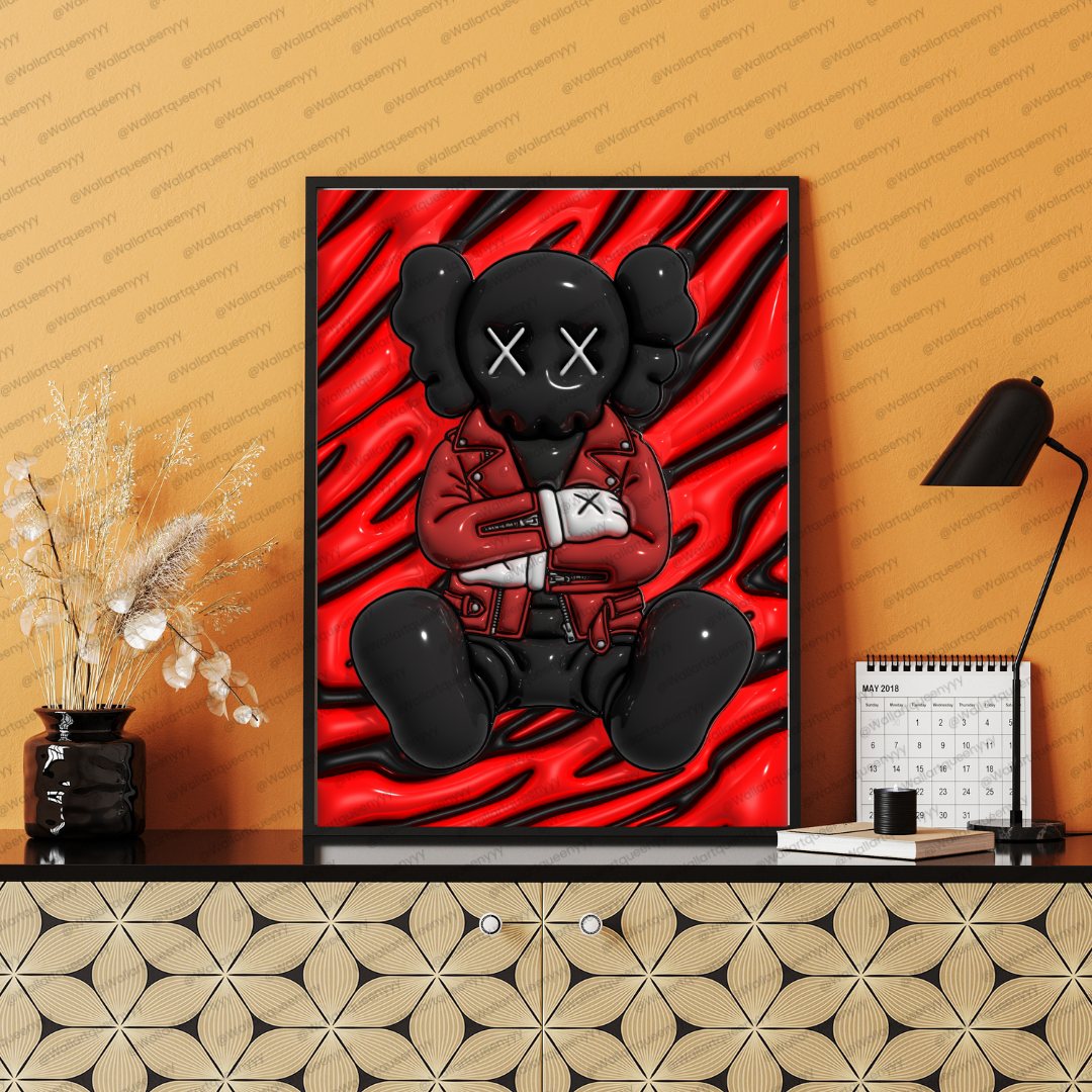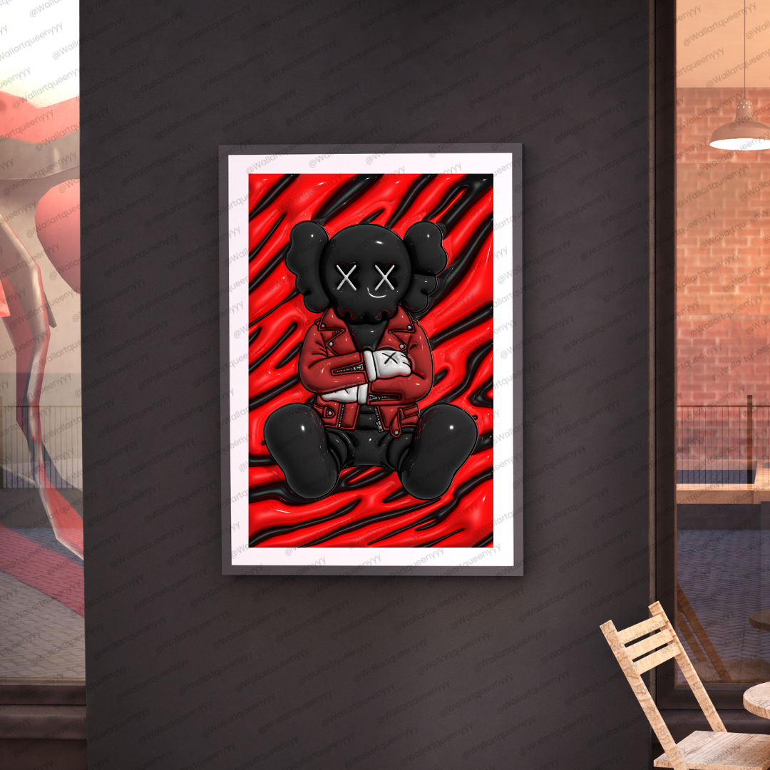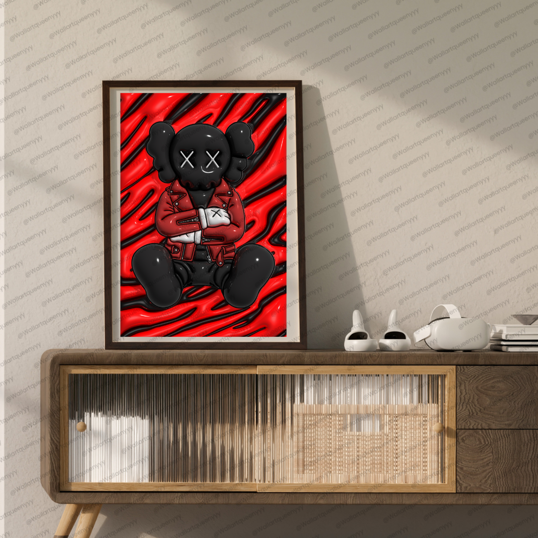 KAWS-inspired Modern Street wall art is a bold printable artwork featuring a pop art toy character designed in deep dark red tones. Inspired by modern street culture and vinyl toy aesthetics, this wall art delivers a strong, edgy visual statement perfect for contemporary and Modern Street-inspired interiors.