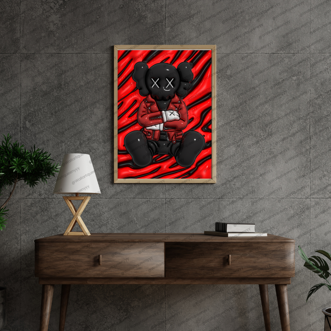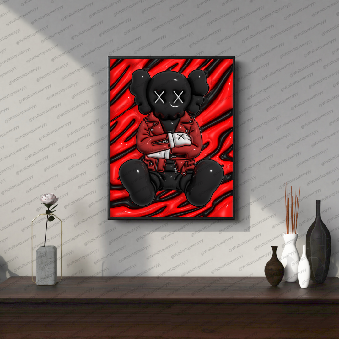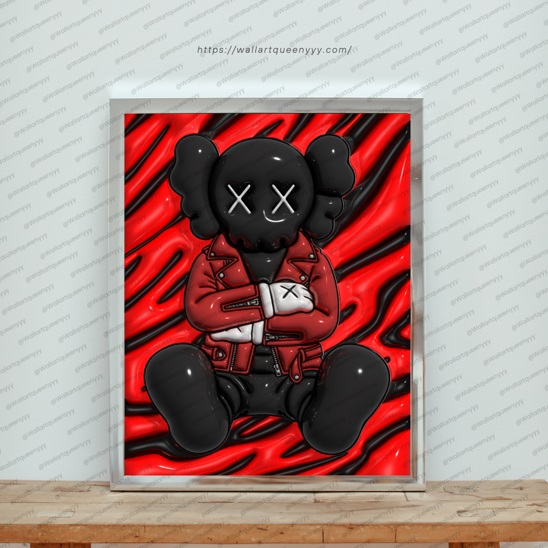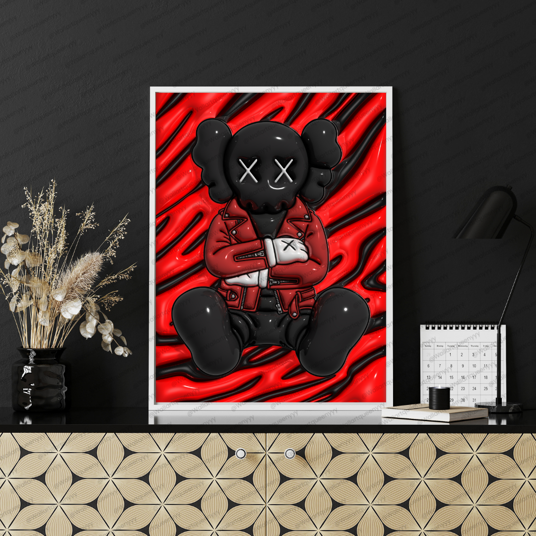 KAWS-inspired Modern Street wall art is a bold printable artwork featuring a pop art toy character designed in deep dark red tones. Inspired by modern street culture and vinyl toy aesthetics, this wall art delivers a strong, edgy visual statement perfect for contemporary and Modern Street-inspired interiors.