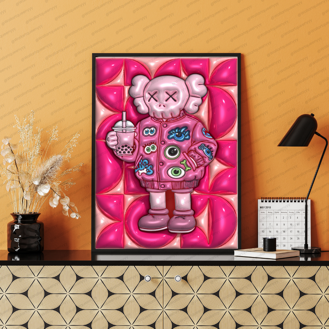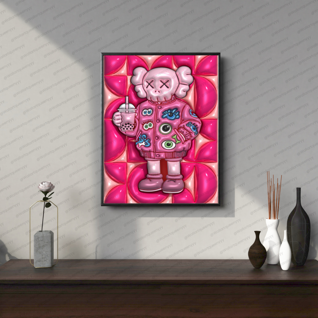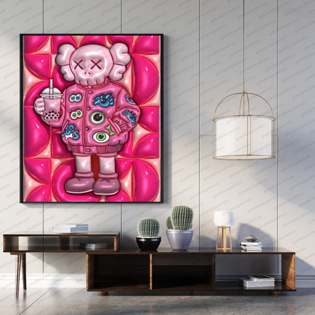 Modern Street pop art blends bold colors, playful characters, and street-inspired design. This KAWS-inspired wall art reflects that aesthetic through expressive character styling, strong outlines, and a modern pink palette that feels trendy and Instagram-ready.