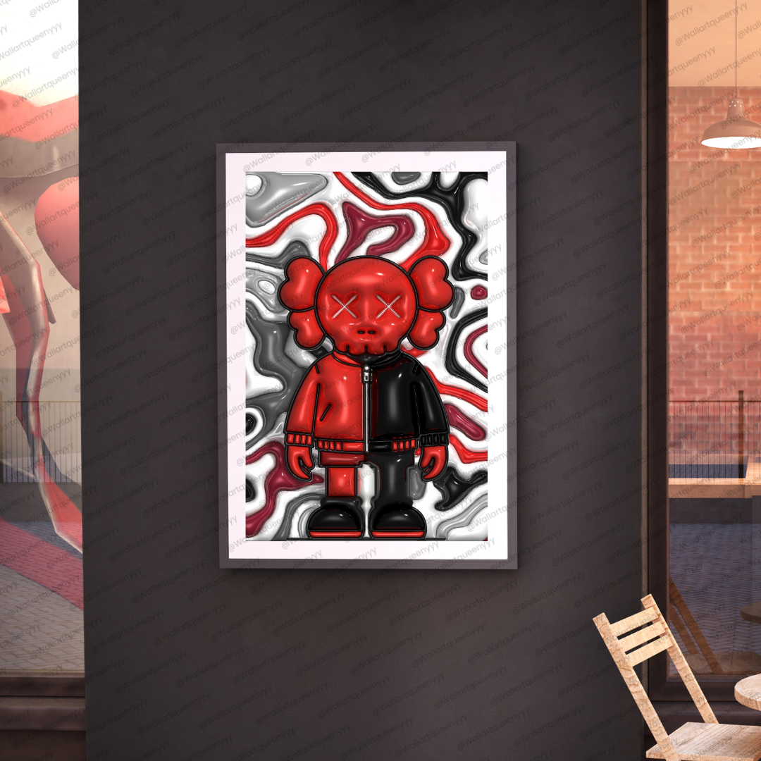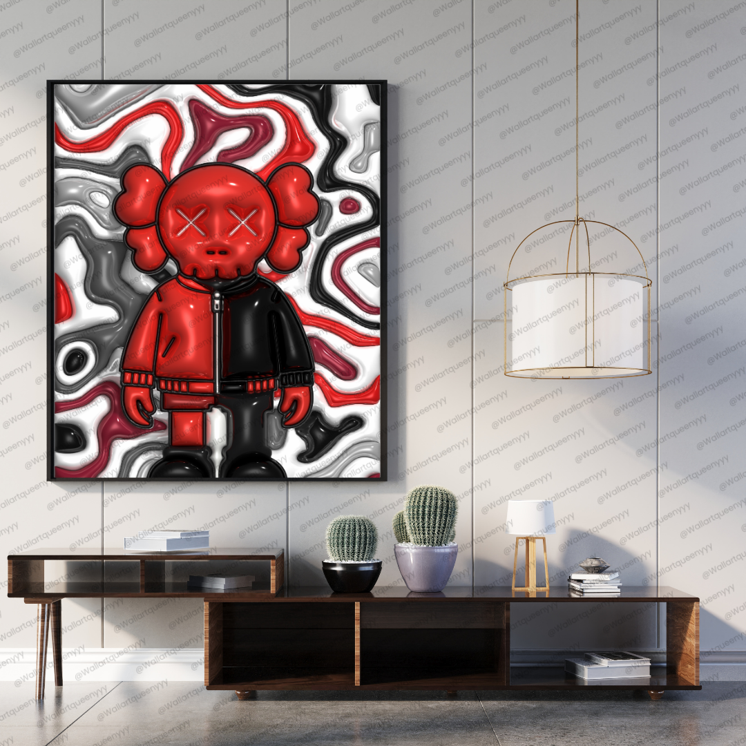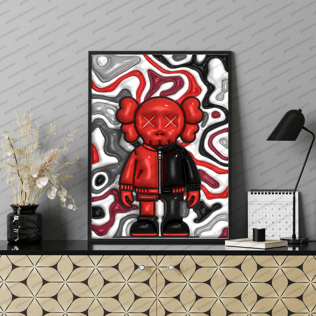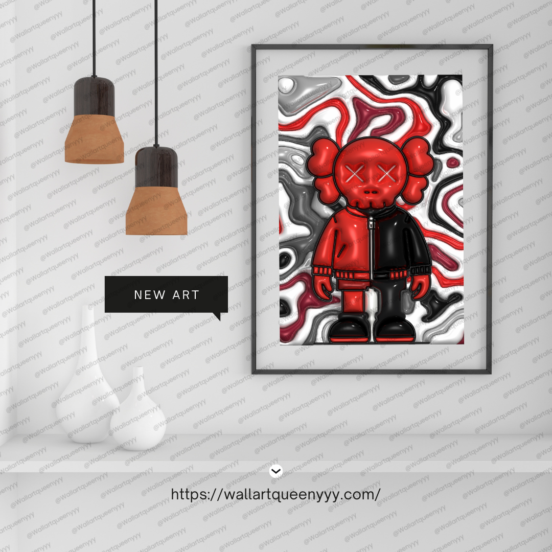 KAWS-inspired Modern Street wall art featuring a red and black pop art toy character with abstract decorative style. Perfect for modern interiors, street-style rooms, and creative spaces. High-resolution printable wall art with complete print-ready sizes.