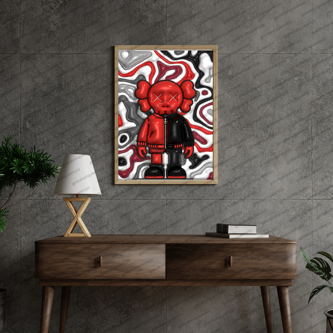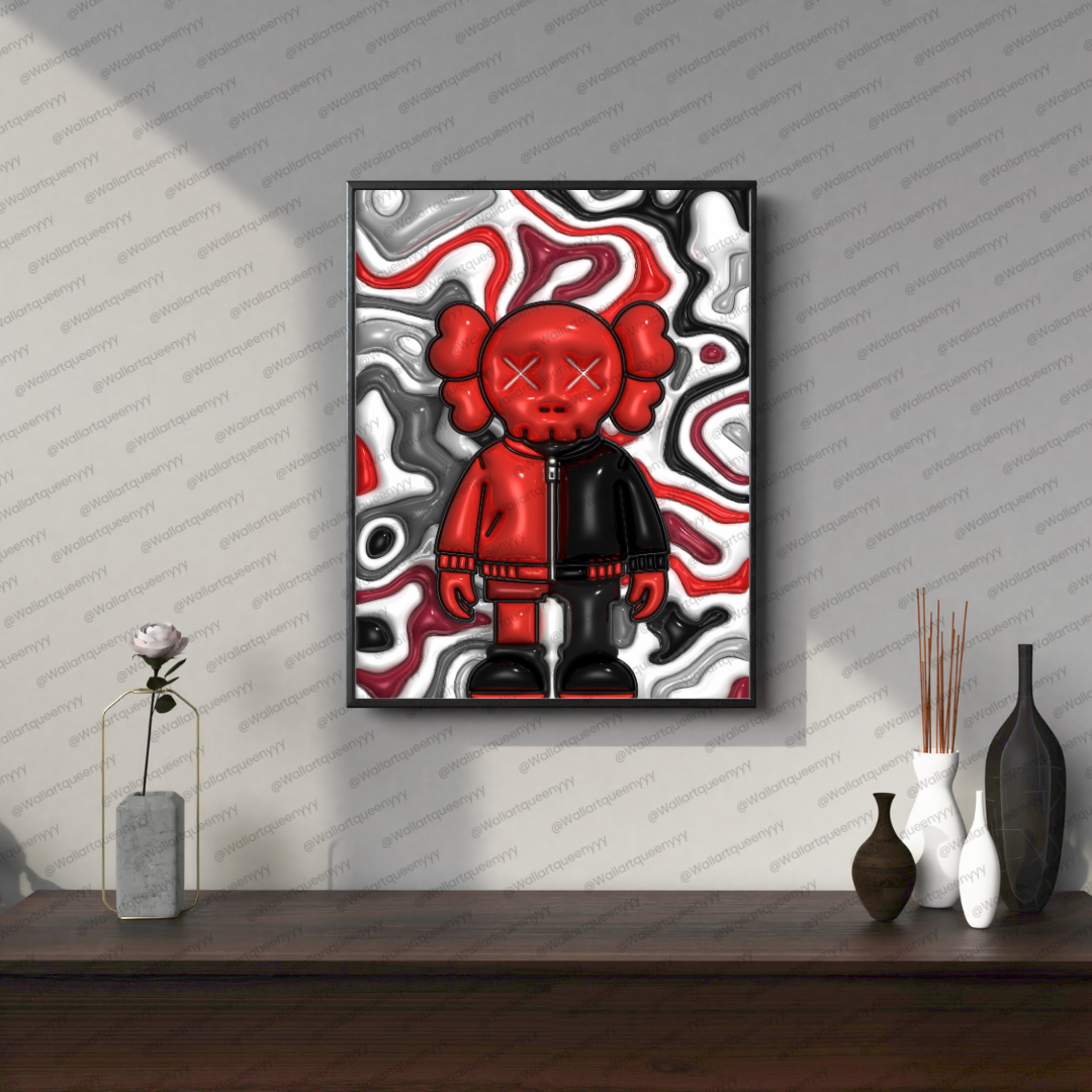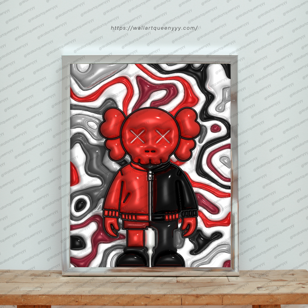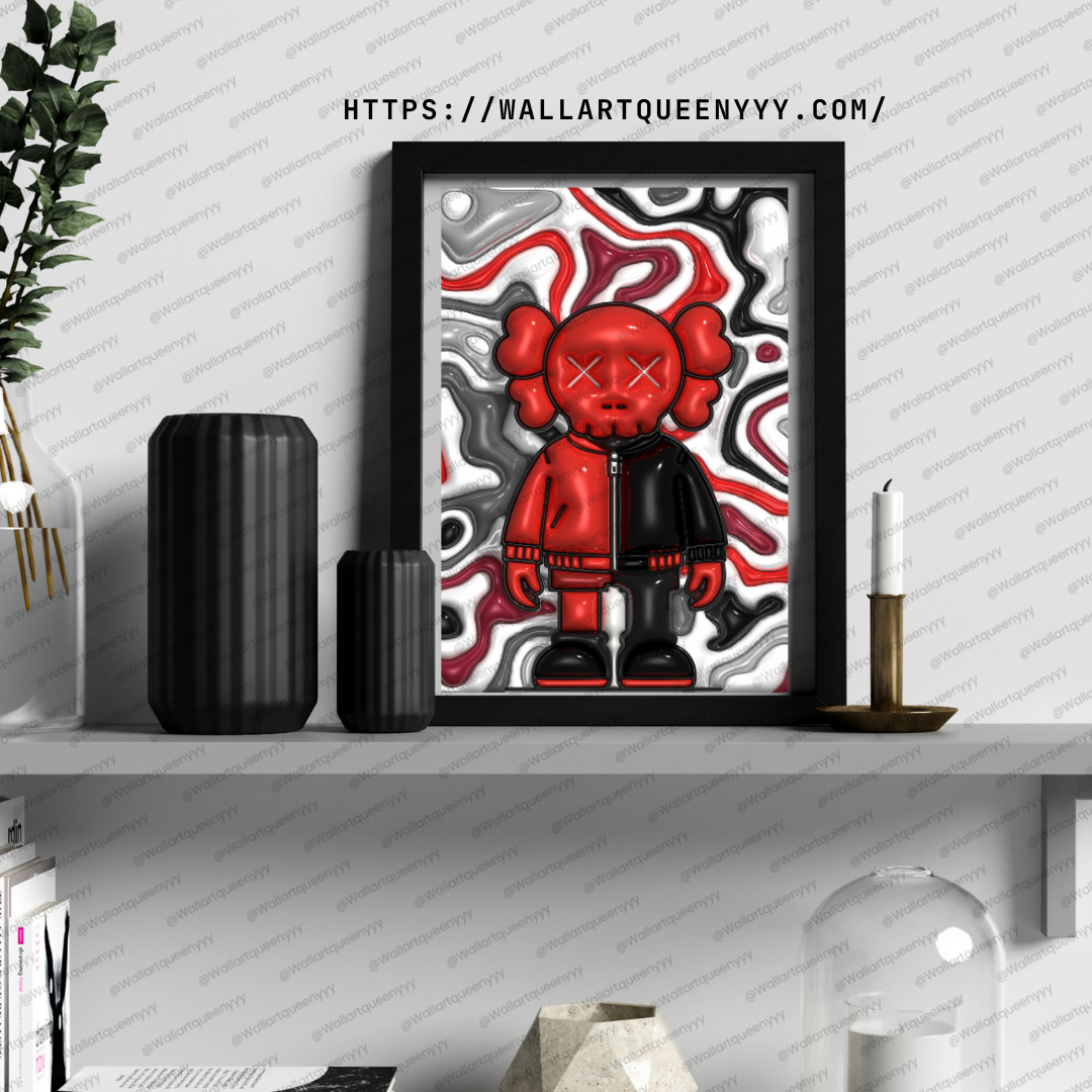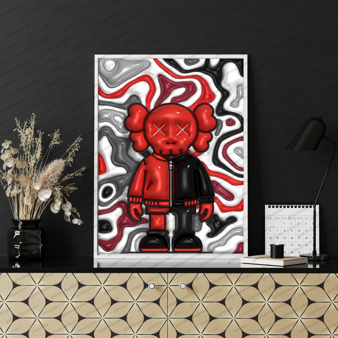KAWS-inspired Modern Street wall art featuring a red and black pop art toy character with abstract decorative style. Perfect for modern interiors, street-style rooms, and creative spaces. High-resolution printable wall art with complete print-ready sizes.