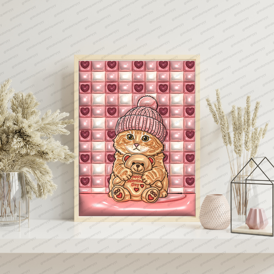 Valentine Kitten Teddy wall art is a cute cozy Valentine-themed printable illustration featuring an adorable kitten wearing a soft knitted beanie while holding a teddy bear with a Valentine message. Set against a quilted heart tile background, this artwork creates a warm, comforting, and emotionally gentle Valentine atmosphere.