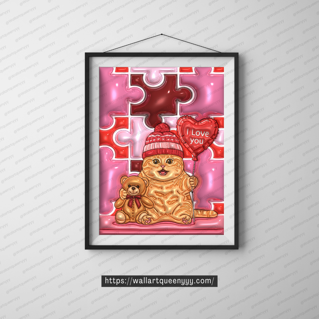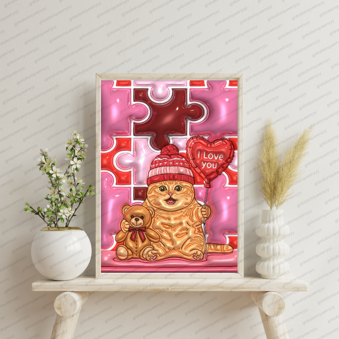 Valentine Puzzle Heart Cat wall art is a cute romantic Valentine-themed printable illustration featuring an adorable chubby cat wearing a cozy beanie, holding a teddy bear, and carrying a heart-shaped balloon with an “I love you” message. The background is designed with interlocking puzzle-style heart shapes, symbolizing connection, togetherness, and emotional bonding.
