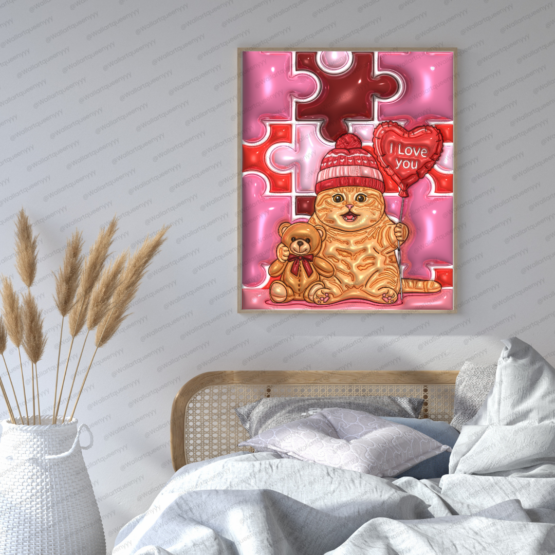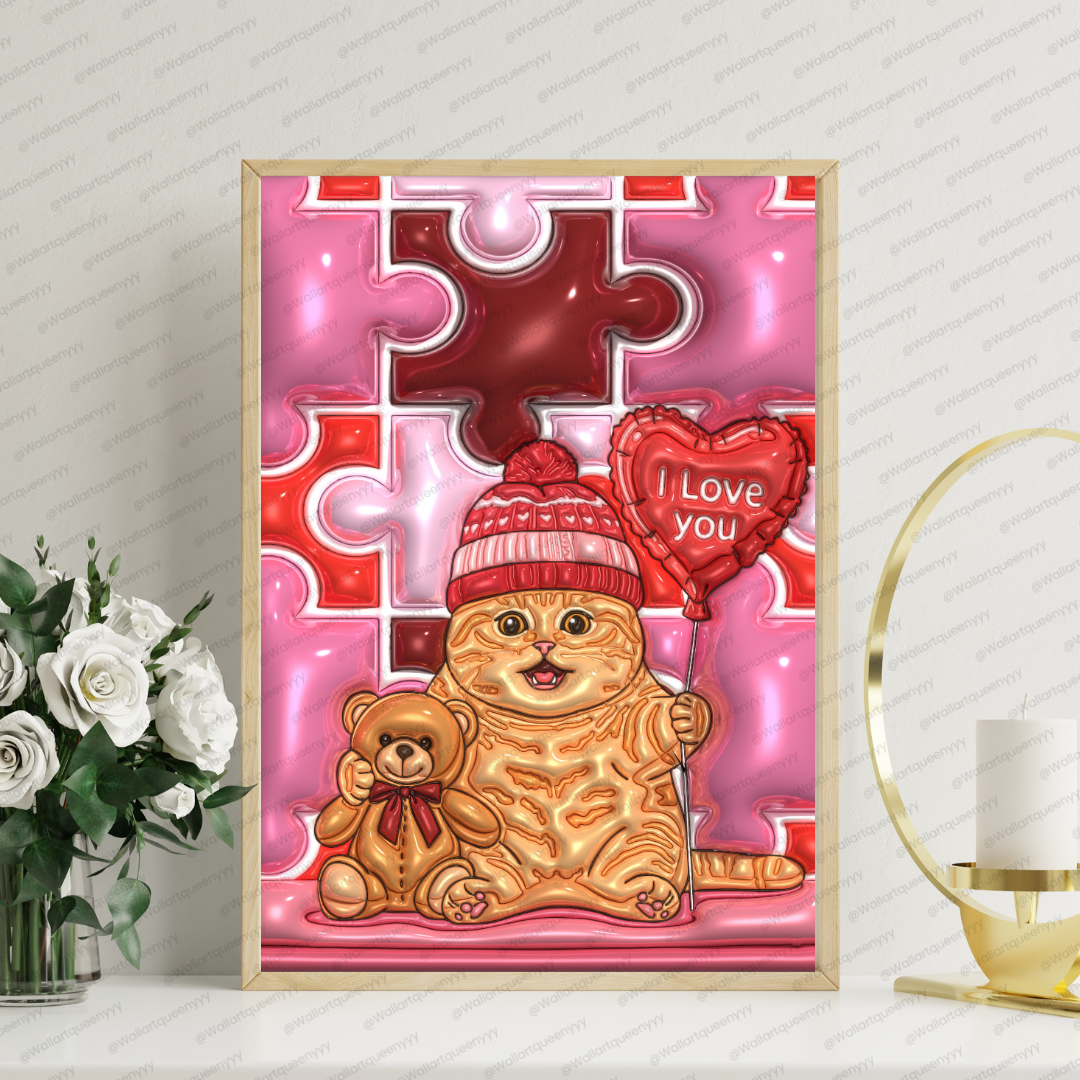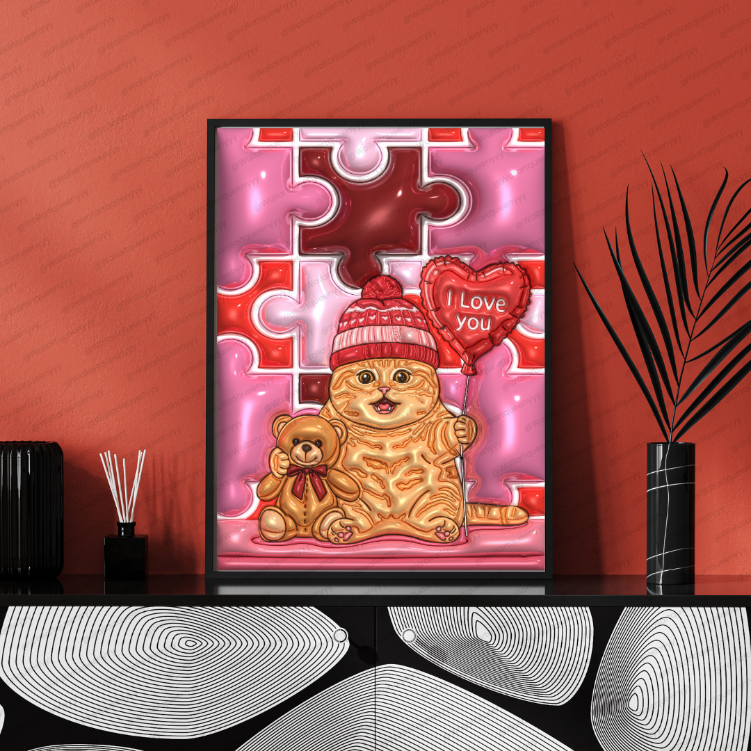 The design of Valentine Puzzle Heart Cat wall art focuses on plush textures, glossy highlights, and rounded forms to create a toy-like, comforting illustration style. The puzzle heart background adds structure and rhythm while maintaining softness through curved shapes and gentle color transitions.