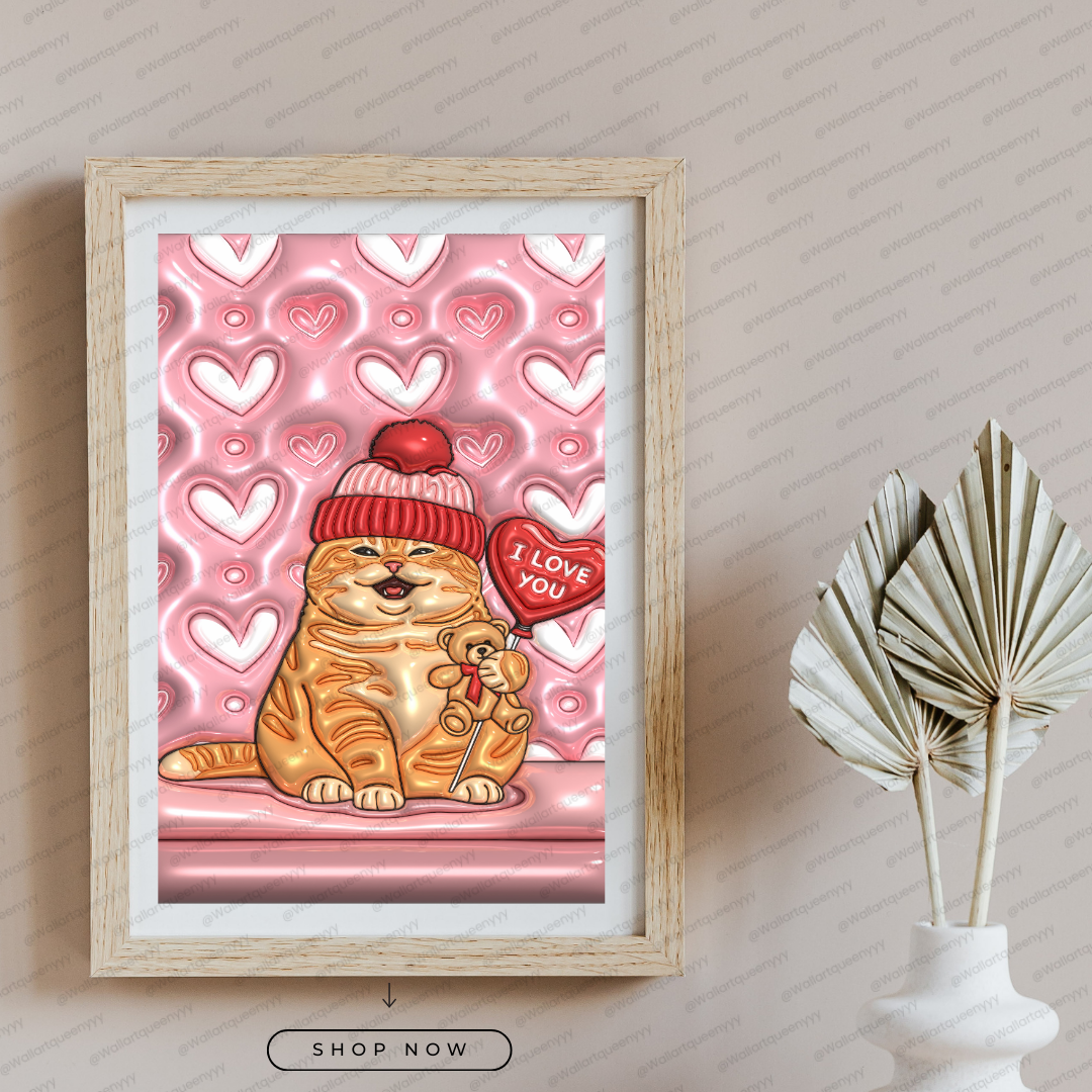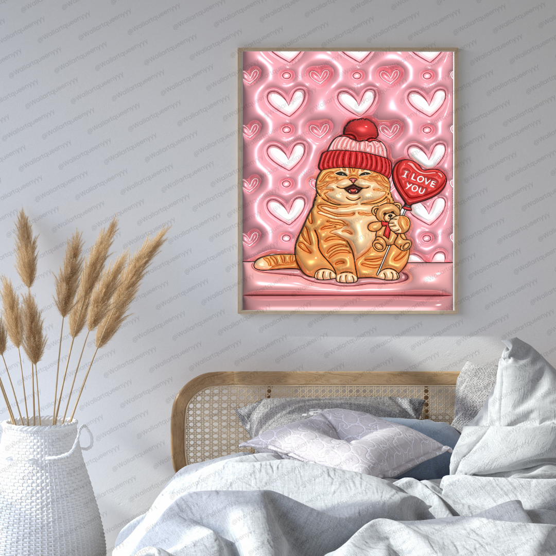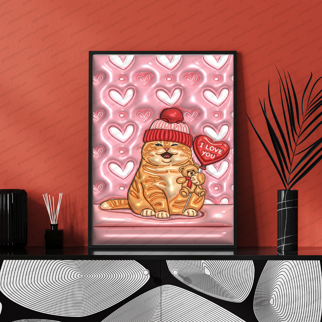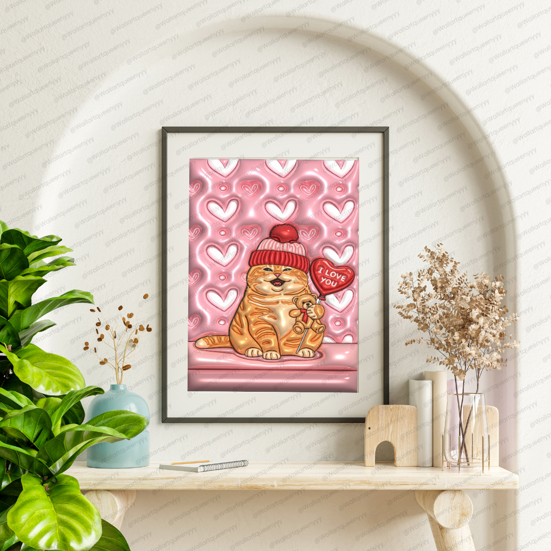 The design of Valentine Soft Heart Cat wall art focuses on plush textures, glossy highlights, and flowing heart shapes to create a dreamy and comforting illustration style. The ripple heart background adds visual depth while maintaining softness and balance.