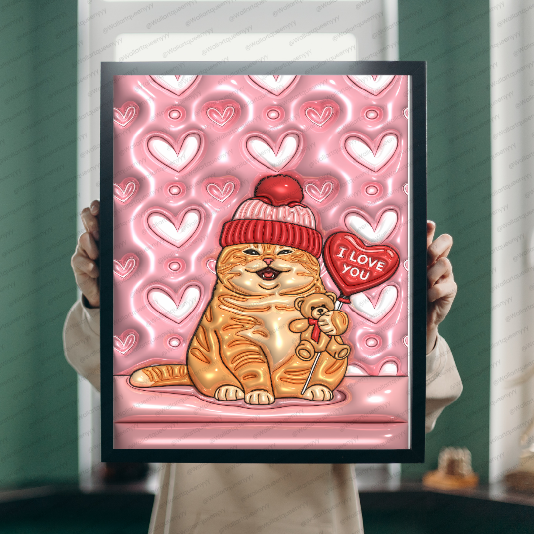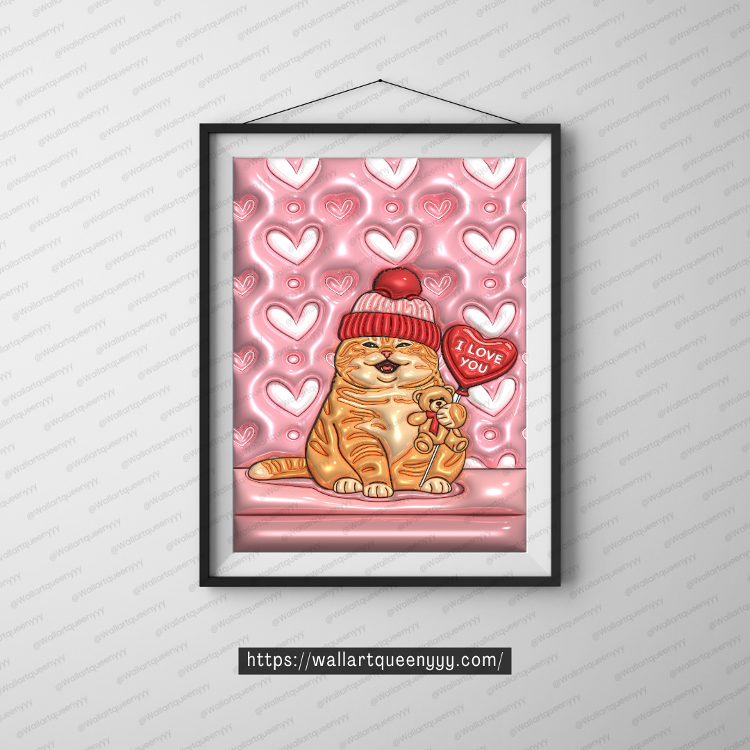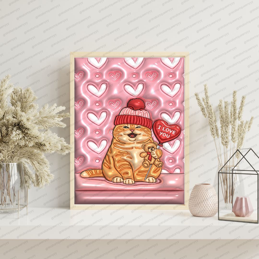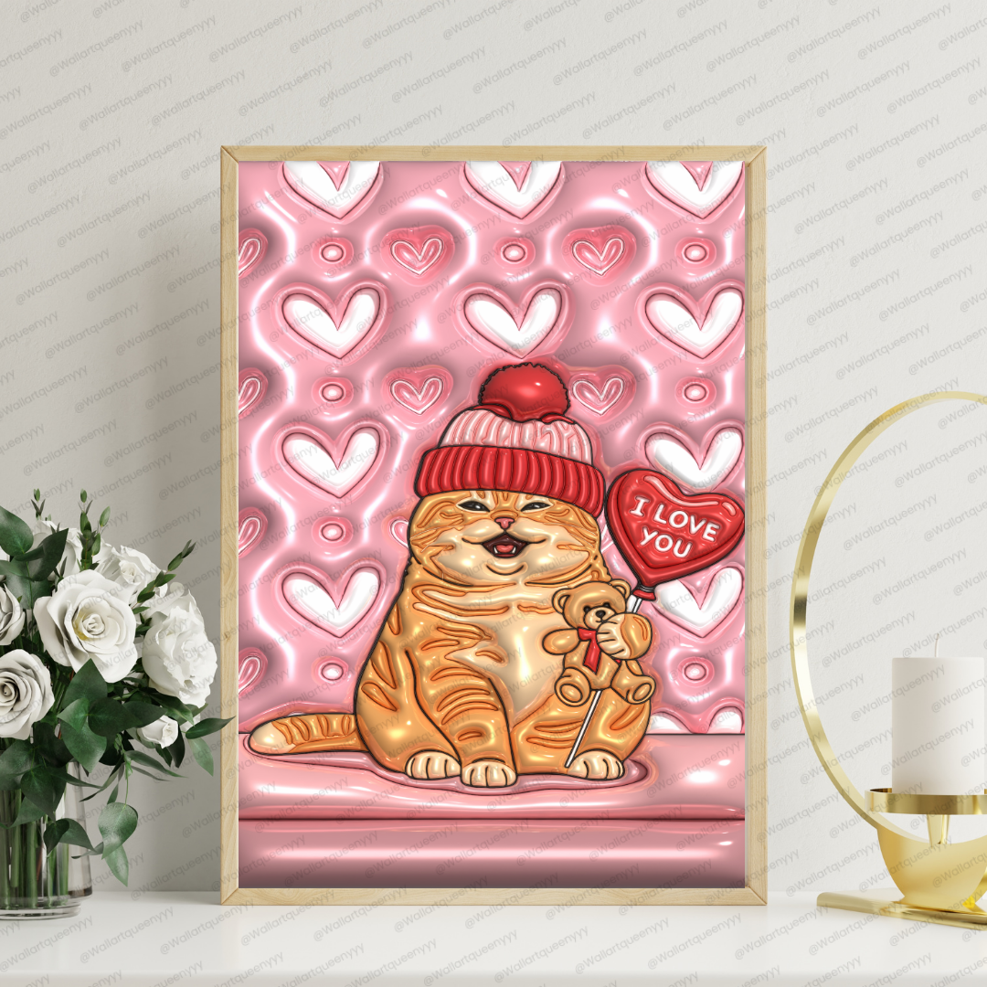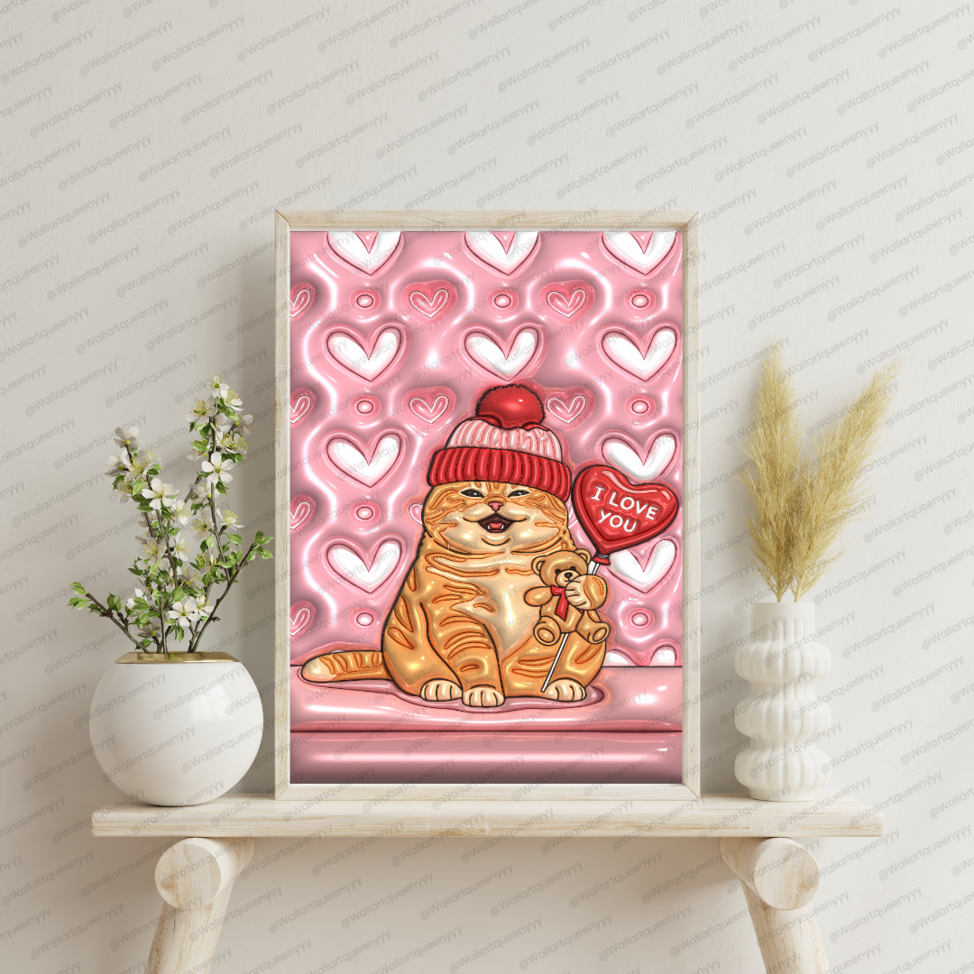 Valentine Soft Heart Cat wall art is a cute romantic Valentine-themed printable illustration featuring a chubby orange cat wearing a cozy beanie, holding a small teddy bear, and standing beside a heart-shaped balloon with an “I love you” message. The background is designed with soft ripple heart patterns that create a dreamy, gentle, and calming Valentine atmosphere.